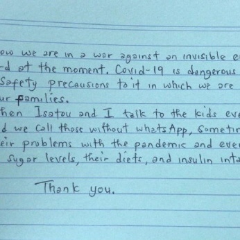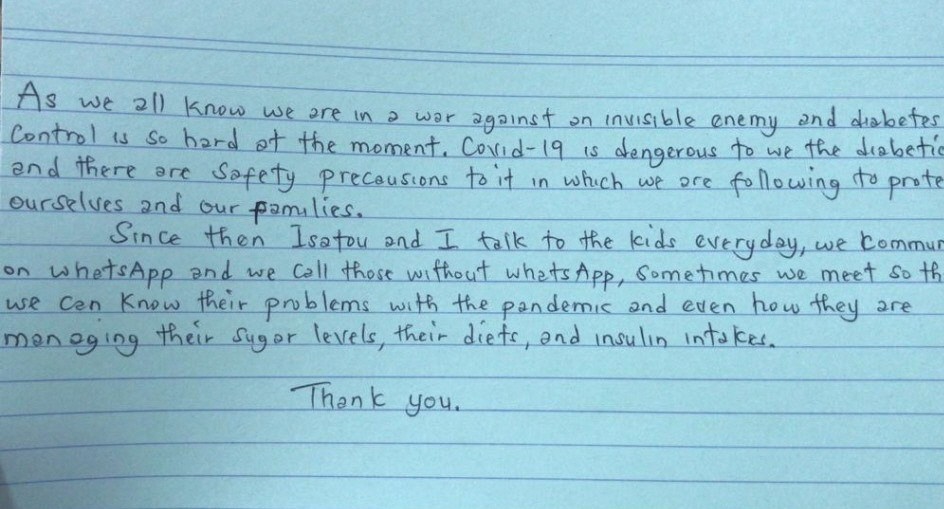 Und wir arbeiten mit Roche zusammen, und hoffen, dass die am 18. März geplante Lieferung der Teststreifen bald stattfindet. Wir bekommen seit Mitte April immer wieder eine Nachricht einer/eines Betroffenen, dass sie nicht mehr messen können. Das ist bitter, weil es eh schon schwierig ist, die Typ1er von Blutzuckermessungen zu überzeugen. Das Gudrun Medical Laboratory von Eliman Jobe kann noch etwas aushelfen, aber seine Vorräte neigen sich dem Ende zu.