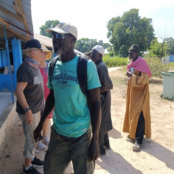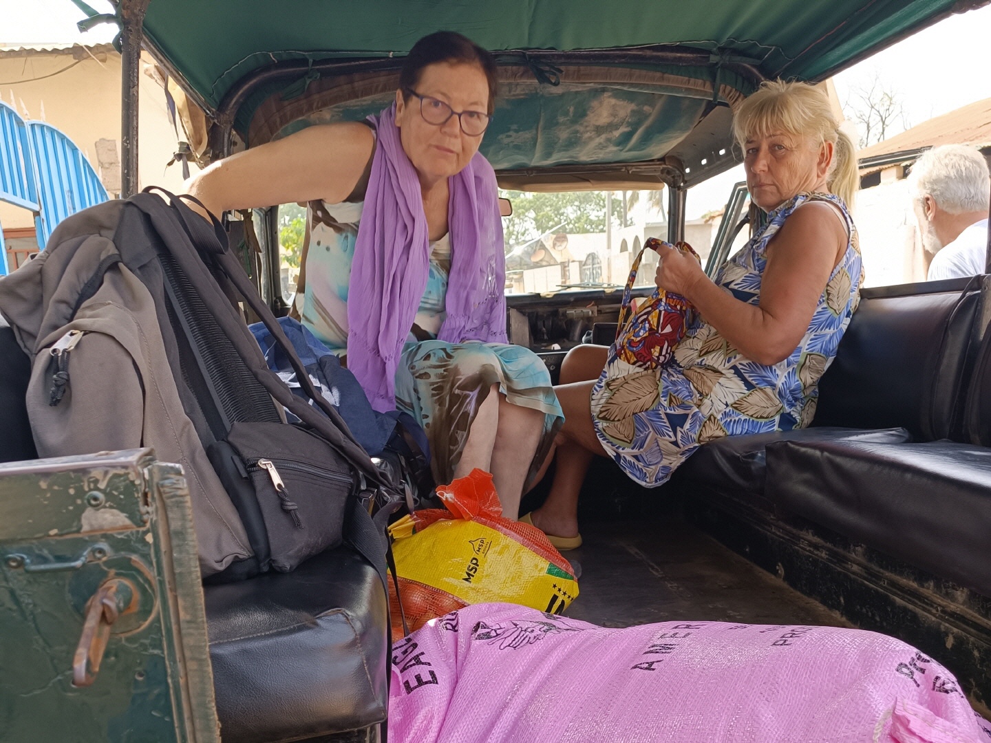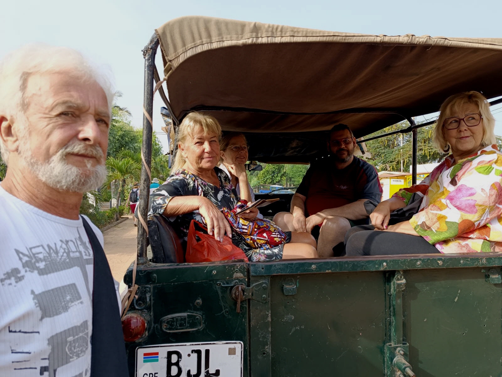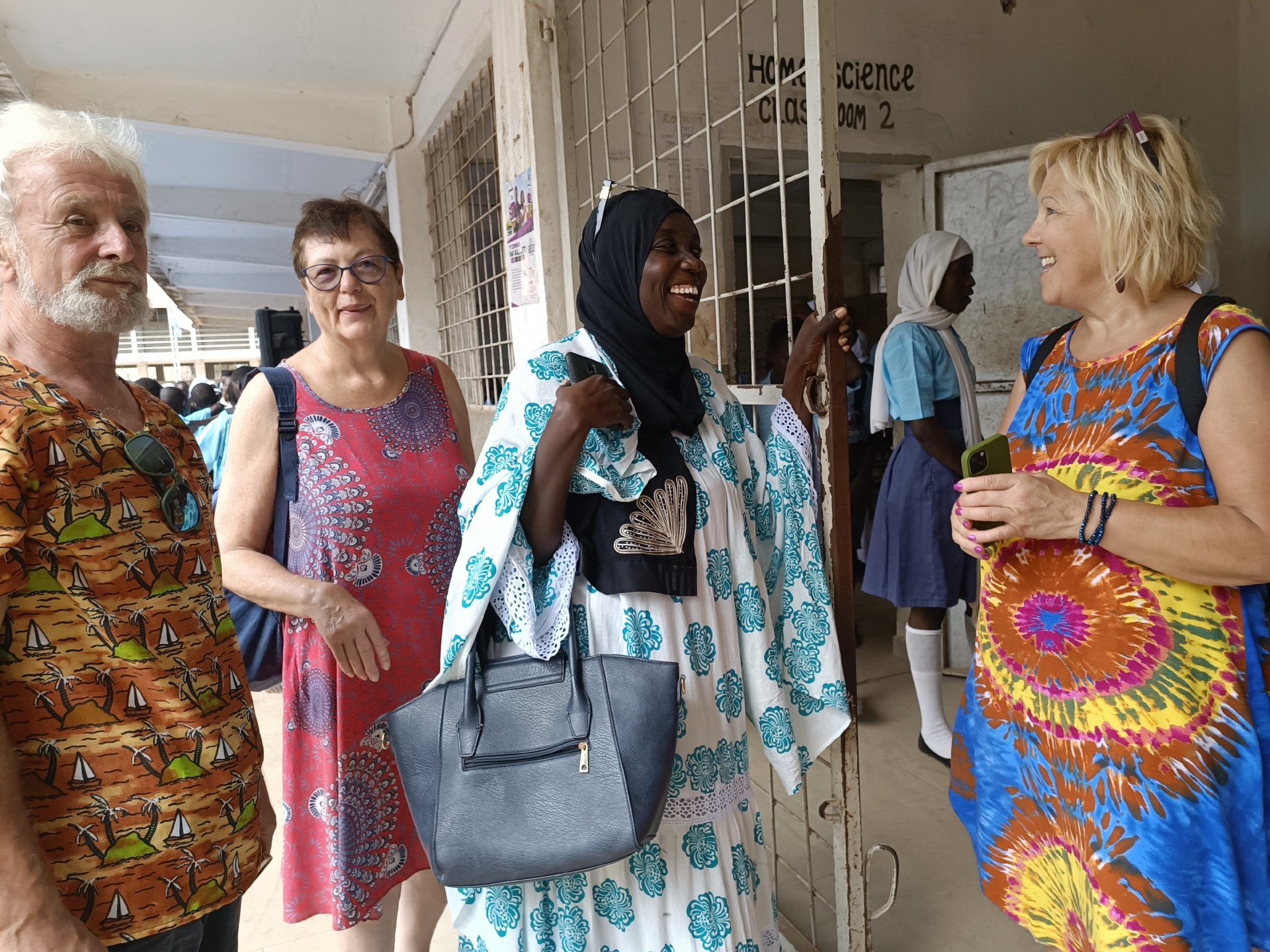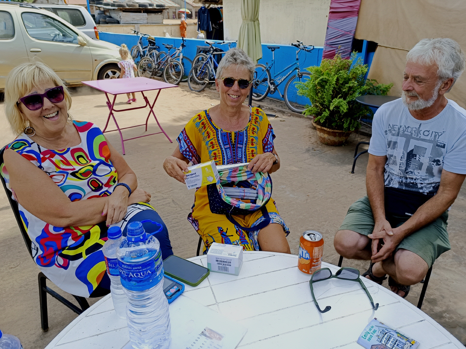 Elvira und Armin mit Mariella wollten ihren Schützling Musa kennenlernen. So haben wir uns am Vormittag nach Gunjur aufgemacht. An der Tankstelle dort haben wir uns zunächst mit Marjan Niemeijr aus Holland getroffen, sie hatte für unser Projekt Insulin gesammelt und hat es uns zur übergeben. Sie gibt hier Jogakurse.