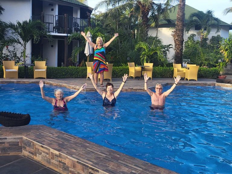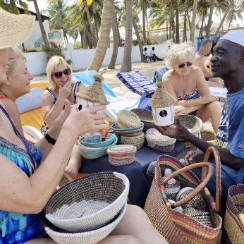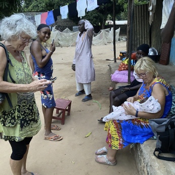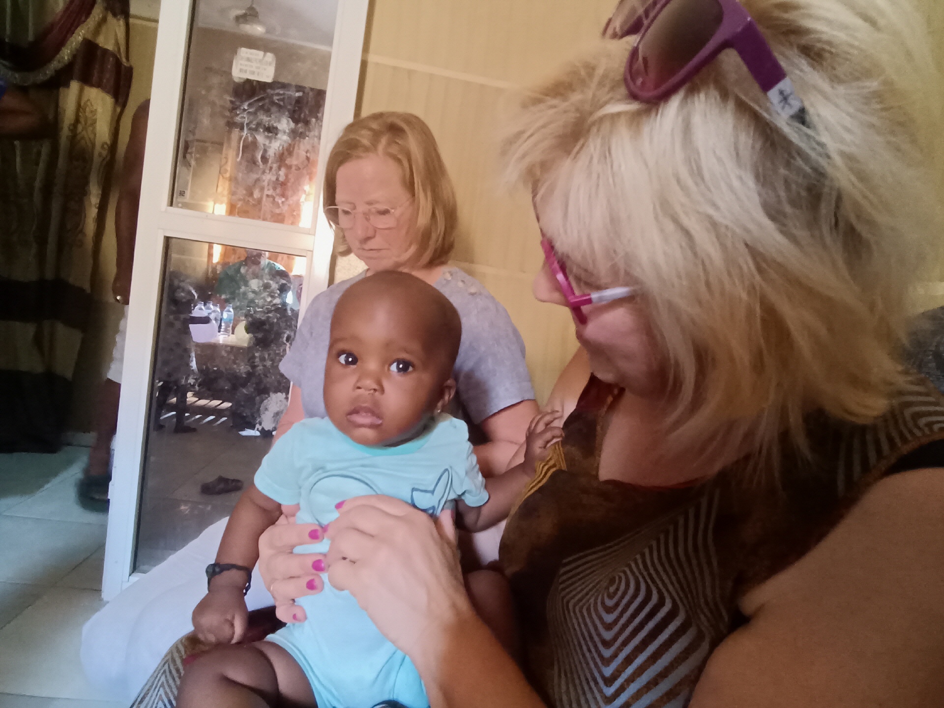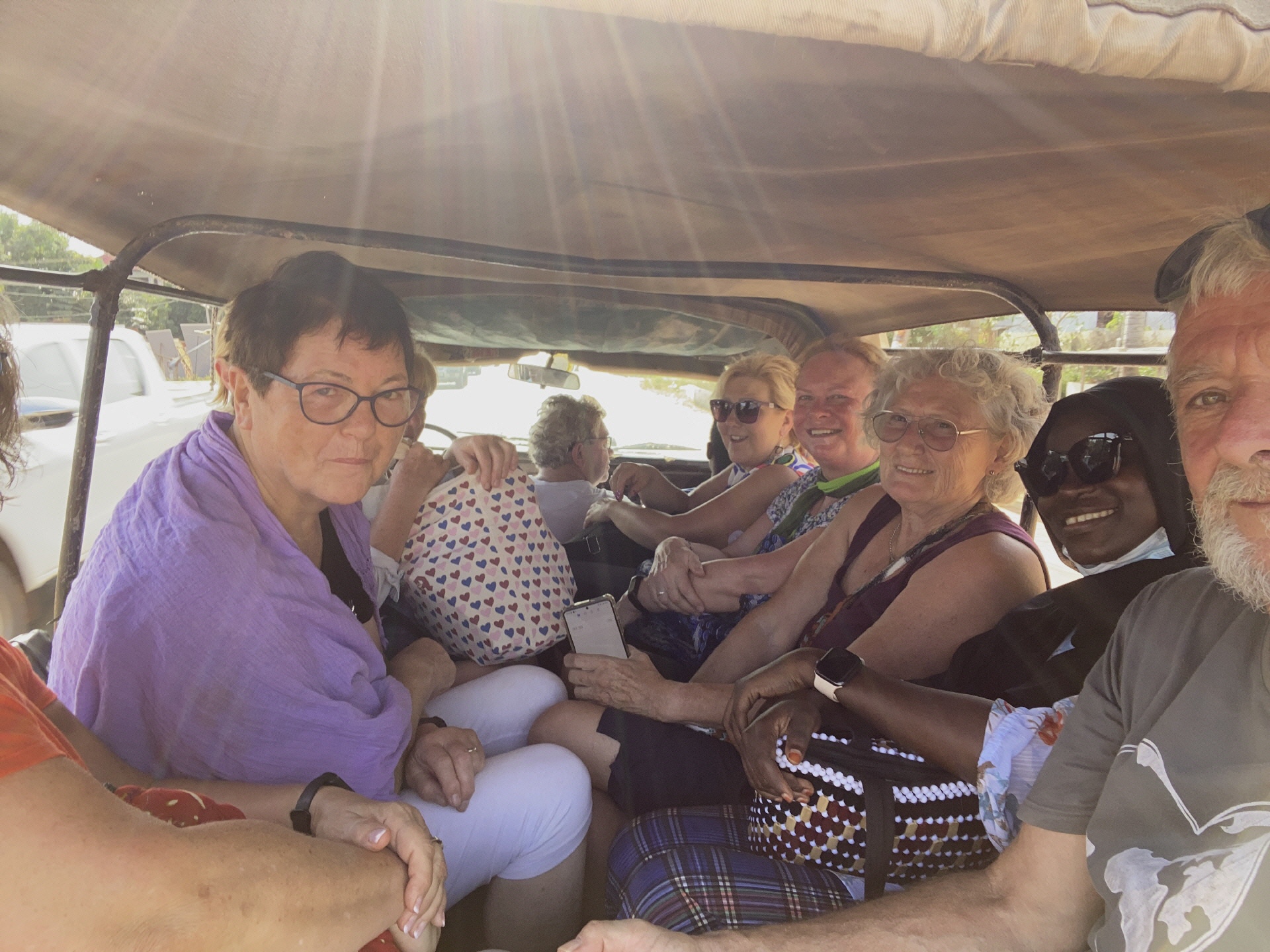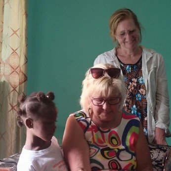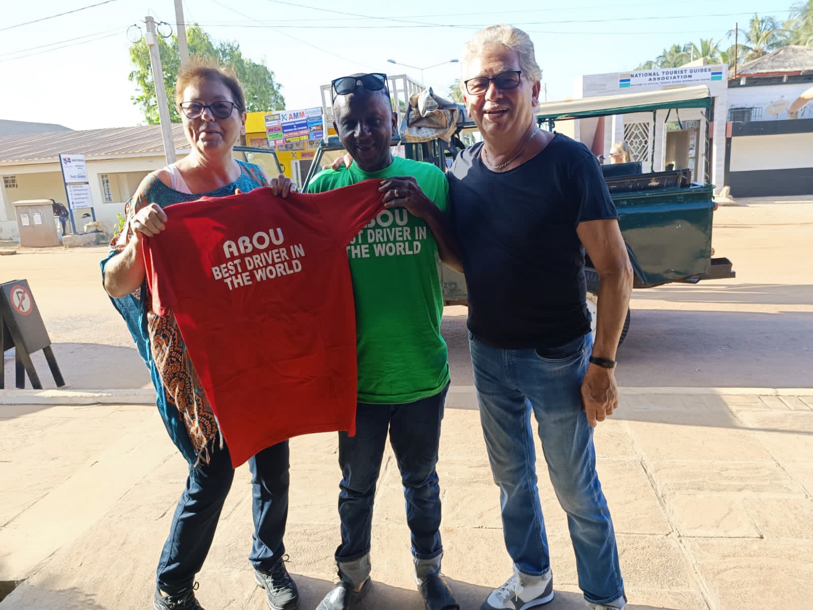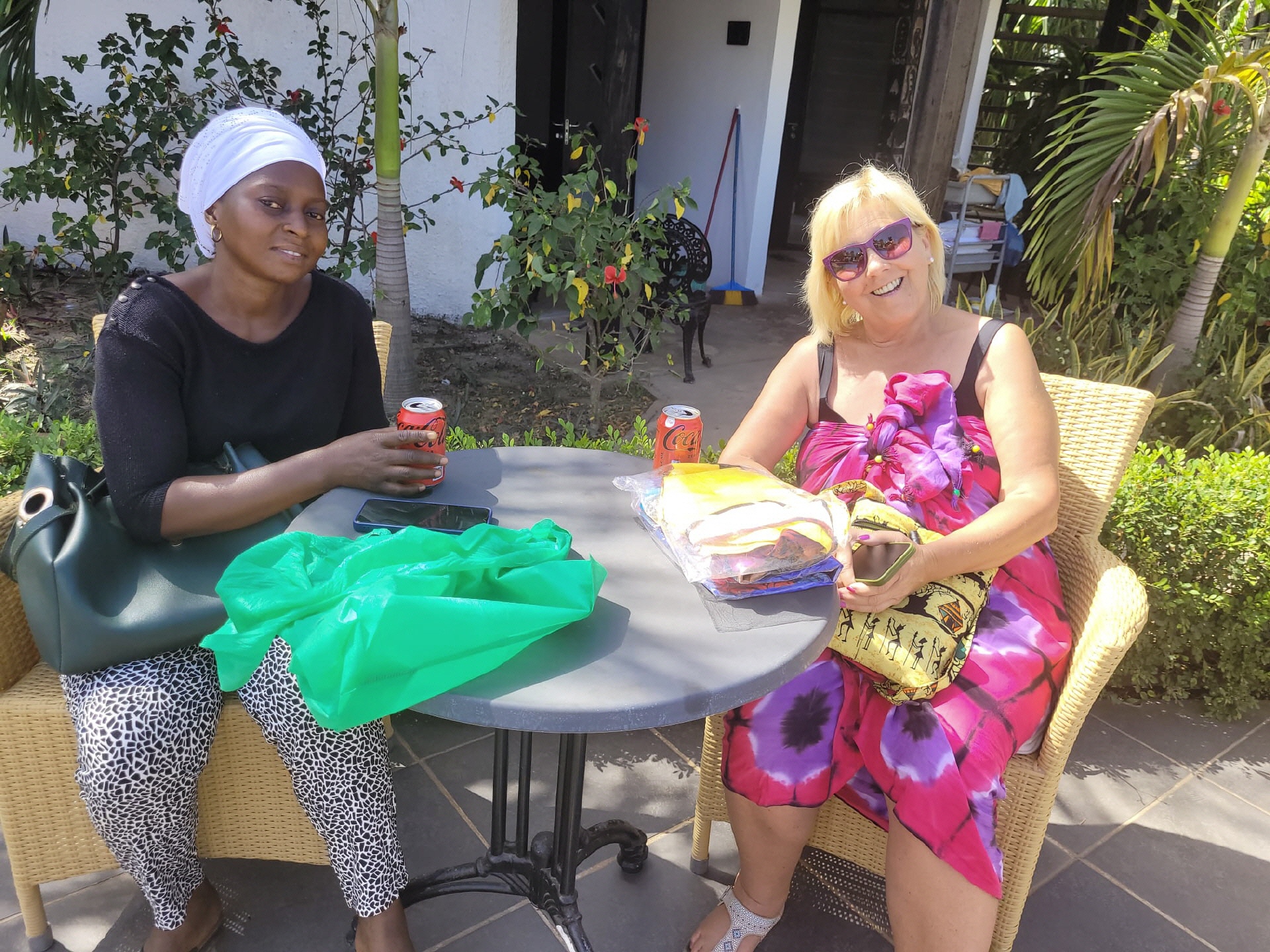 Elvira und Armin mit Mariella wollten ihren Schützling Musa kennenlernen. So haben wir uns am Vormittag nach Gunjur aufgemacht. An der Tankstelle dort haben wir uns zunächst mit Marjan Niemeijr aus Holland getroffen, sie hatte für unser Projekt Insulin gesammelt und hat es uns zur übergeben. Sie gibt hier Jogakurse.