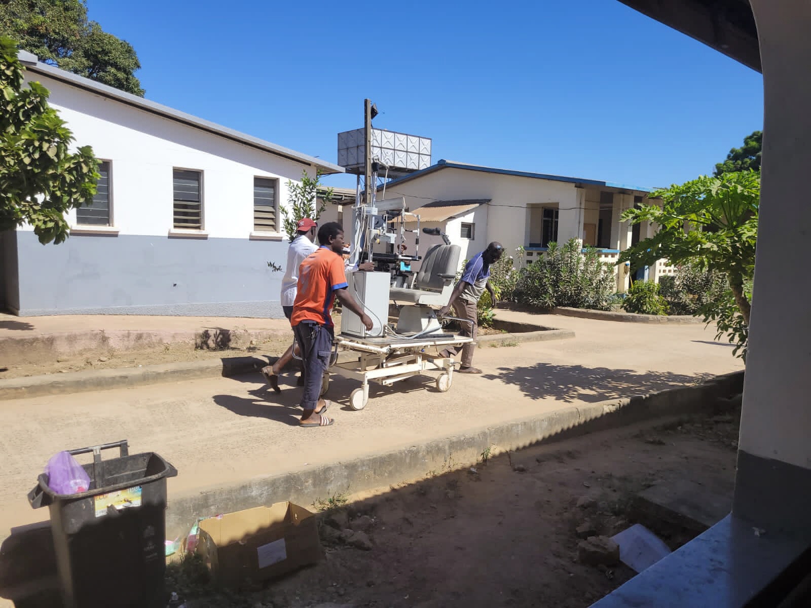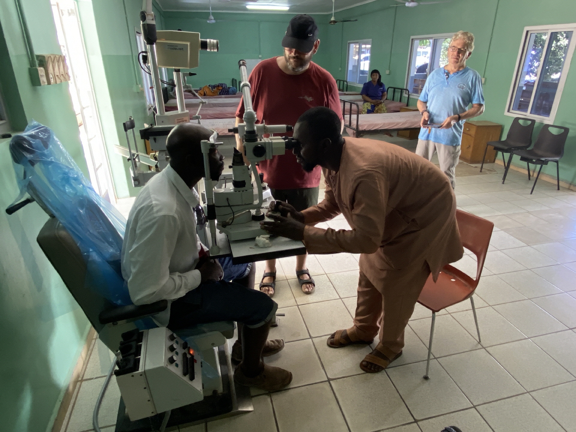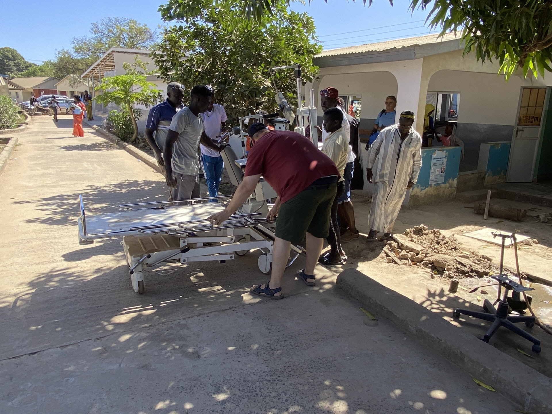 Heute haben sich Klaus, Steffen (Optik Pfeiffer Stetten) und Roland die Zeit genommen, um nach der Refraktometereinheit in der Brikama-Augenklinik zu schauen. Dort angekommen, wurde sie gleich gefunden. Sie stand am gleichen Ort, wo Steffen sie im November 2021 aufgebaut hatte, etwas eingestaubt, nie benutzt. Wir haben dort gleich den Arzt Ousman B. Ceesay getroffen (er macht Augen-OPs), er möchte sie gerne nutzen, aber direkt auf der Augenstation. Wir mussten Werkzeug kaufen, da war in der Klinik nichts aufzufinden! Sechs Gambier aus der Klinik haben wir zusammengetrommelt, es wurde ein fahrbares Unterbett herangerollt, ein Stück Baumstamm aus der Klinik, der irgendwo herumlag. Mit vereinten Kräften (Maschine wiegt 350kg?) wurde das Gerät um das Gebäude getragen/gefahren und an den Platz geschafft, wo sie in Betrieb genommen werden sollte. Steffen hat alles kontrolliert, bis sie wieder funktionsfähig war. Na dann. Das hätten wir wohl schon 2 Wochen machen sollen!!