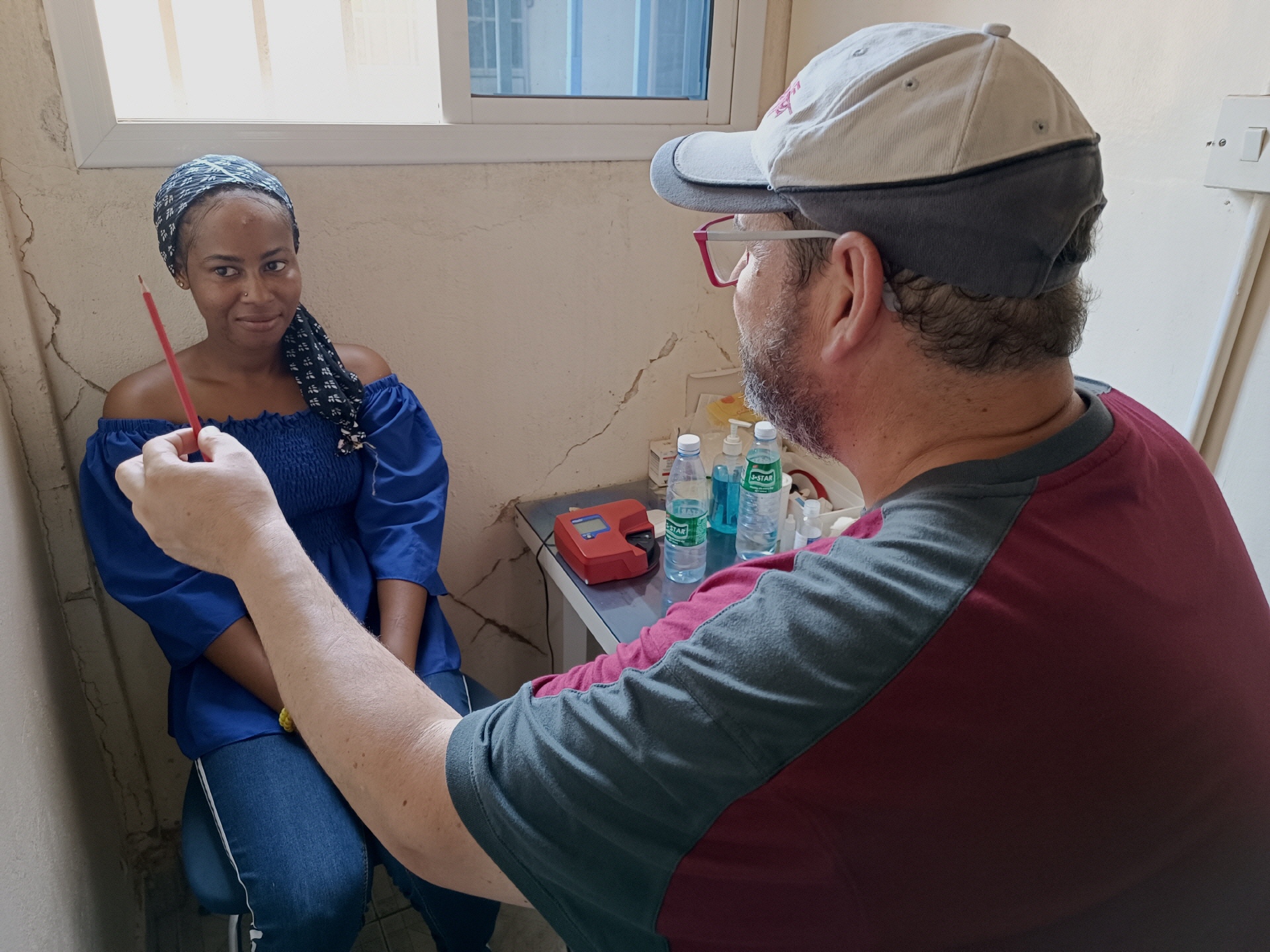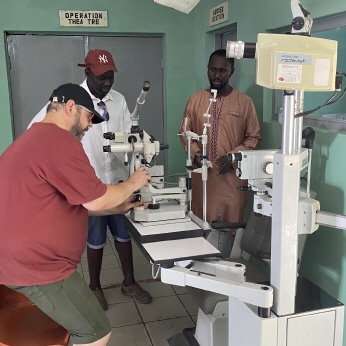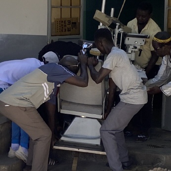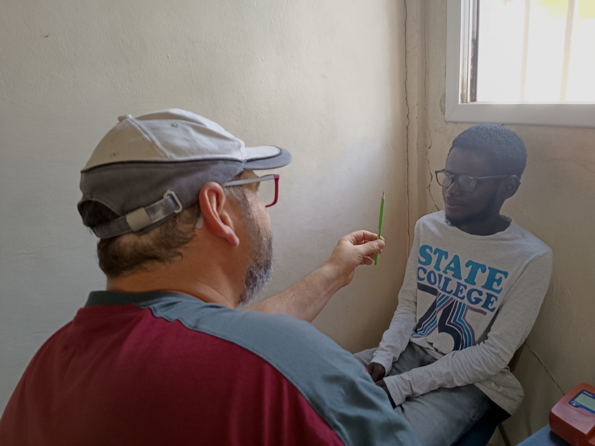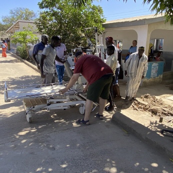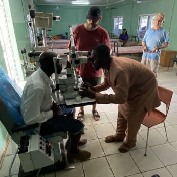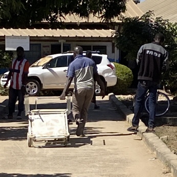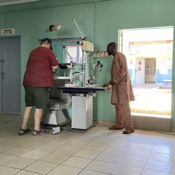 Heute haben sich Klaus, Steffen (Optik Pfeiffer Stetten) und Roland die Zeit genommen, um nach der Refraktometereinheit in der Brikama-Augenklinik zu schauen. Dort angekommen, wurde sie gleich gefunden. Sie stand am gleichen Ort, wo Steffen sie im November 2021 aufgebaut hatte, etwas eingestaubt, nie benutzt. Wir haben dort gleich den Arzt Ousman B. Ceesay getroffen (er macht Augen-OPs), er möchte sie gerne nutzen, aber direkt auf der Augenstation. Wir mussten Werkzeug kaufen, da war in der Klinik nichts aufzufinden! Sechs Gambier aus der Klinik haben wir zusammengetrommelt, es wurde ein fahrbares Unterbett herangerollt, ein Stück Baumstamm aus der Klinik, der irgendwo herumlag. Mit vereinten Kräften (Maschine wiegt 350kg?) wurde das Gerät um das Gebäude getragen/gefahren und an den Platz geschafft, wo sie in Betrieb genommen werden sollte. Steffen hat alles kontrolliert, bis sie wieder funktionsfähig war. Na dann. Das hätten wir wohl schon 2 Wochen machen sollen!!
