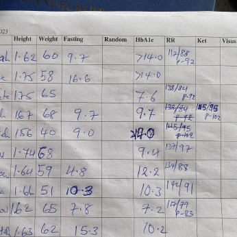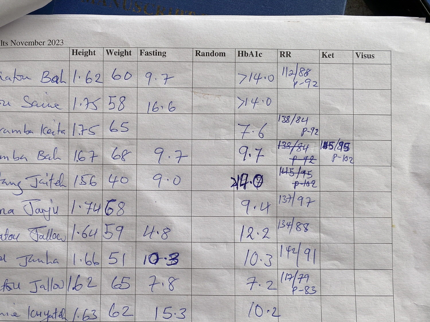 25 Diabetiker waren heute hier, und es war ein Gemisch aus guten und schlechten Werten. Lichtblicke mit besseren Werten seit April 2023 gab es bei vier Personen. Endlich sind Kumba Bah und Fatima Mendy auf dem Weg von >14% auf nun bei 10%, auch Isatou Jallow hat sich verbessert. Verschlechtert hatte sich definitiv niemand, das empfinden wir schon als Fortschritt, besonders nach der Regenzeit. Daraus ziehen wir einen Teil unserer Motivation!!