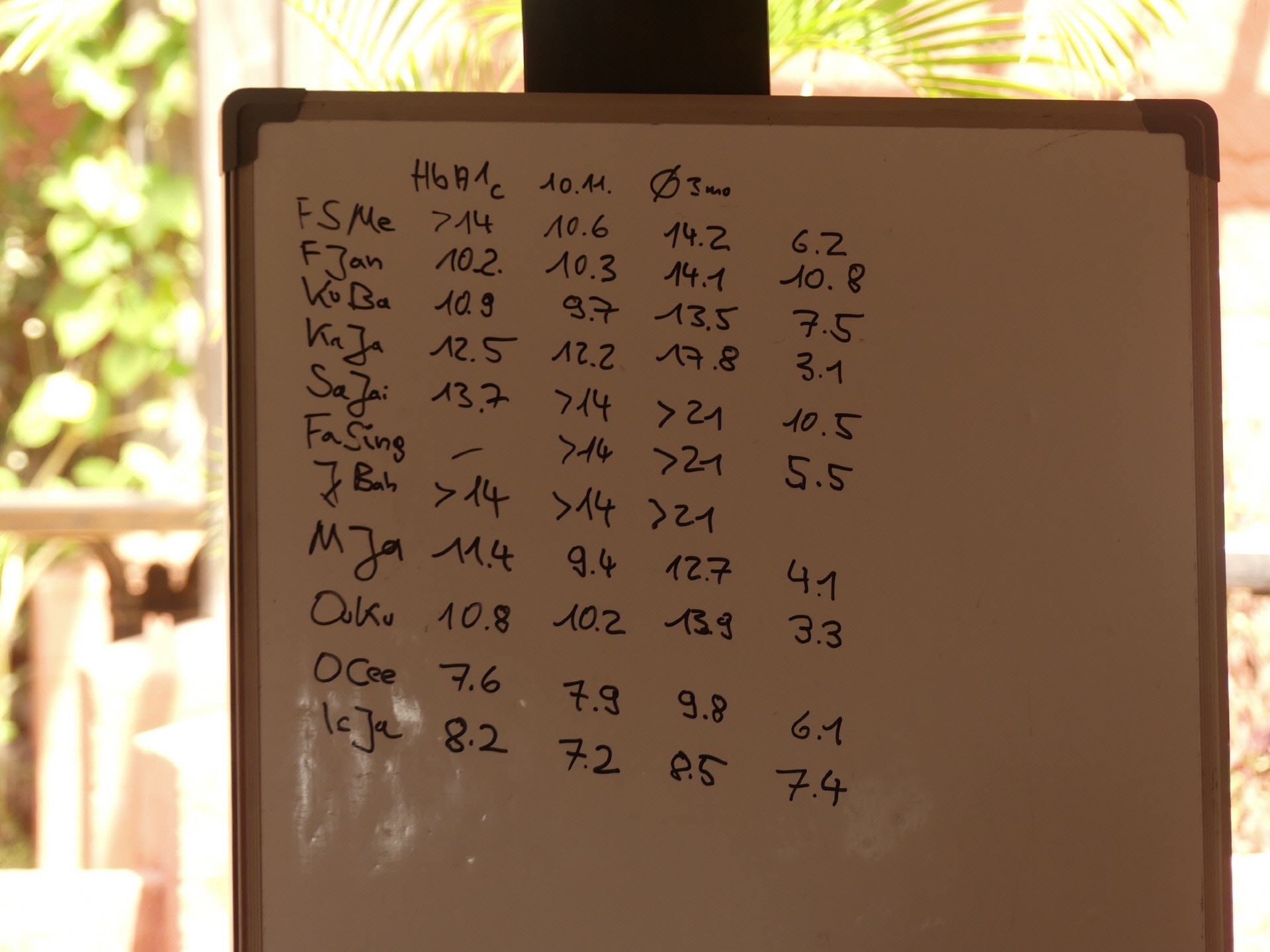 Adama S. ist schwanger, da haben wir ihr Metformin abgesetzt. Wir haben ihr beigebracht, eine abendliche Insulindosis zu spritzen. Das ist eine kleine Auswahl unserer "Erlebnisse".