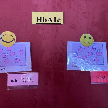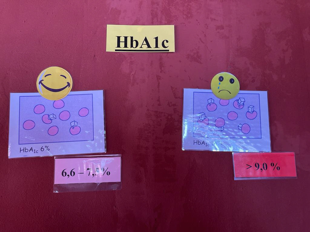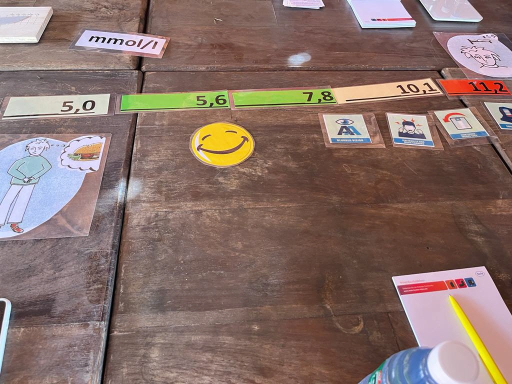 Den Teil des Langzeitzuckers hat wiederum Katja übernommen. Zunächst hatte Roland die HbA1c-Werte aufgemalt vom April, bis zu den aktuellen Werten vom gestrigen Freitag. Drei der Ergebnisse waren wesentlich besser als noch vor 6 Monaten, weitere auf dem richtigen Weg zu besseren aber noch nicht zufriedenstellenden Werten, das war echt erfreulich! Ousman übernahm den letzten Teil unseres Workshops mit dem Thema Folgeschäden.