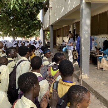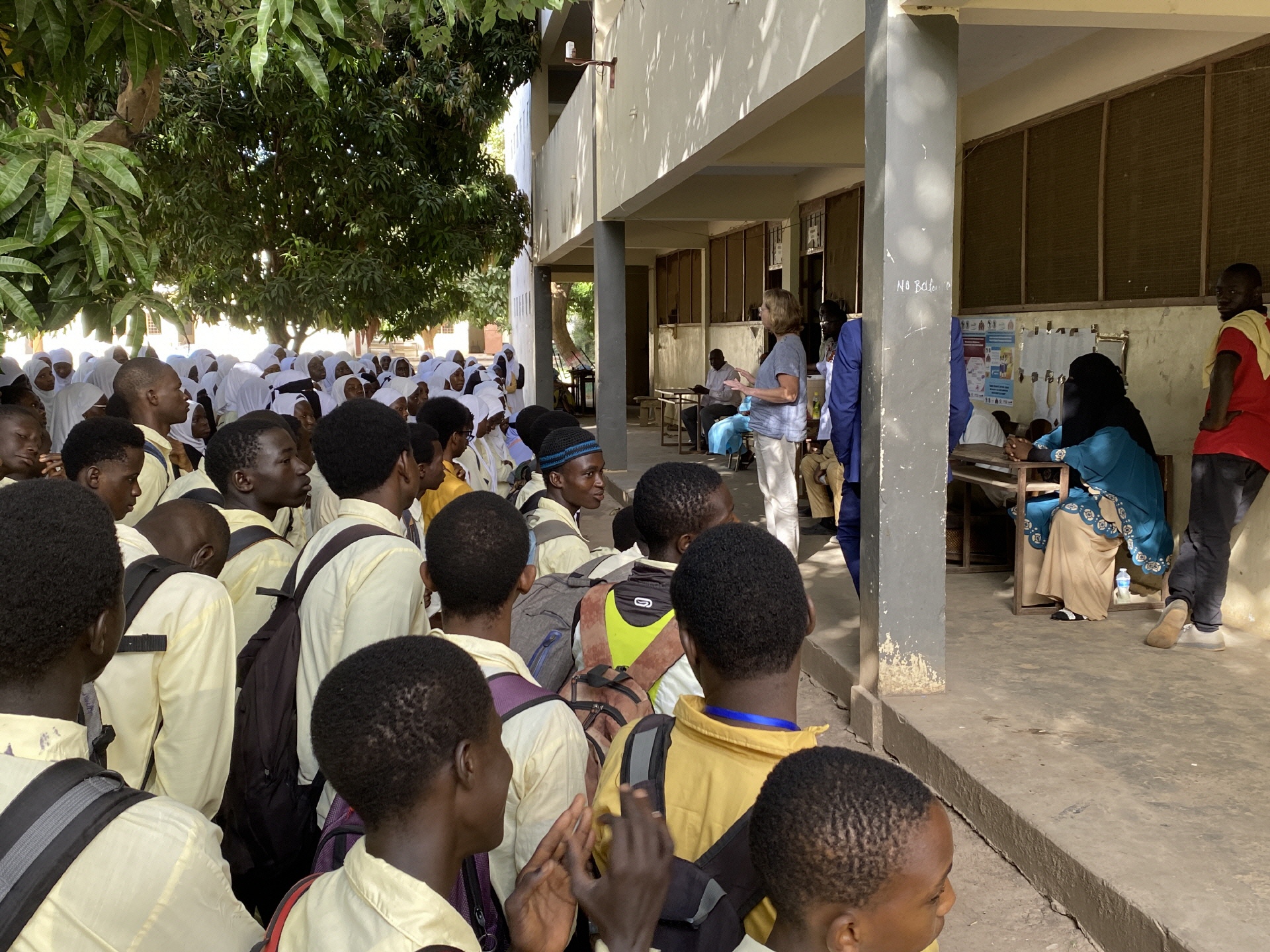 Montag: am späten Vormittag ist Roland nach Bakoteh in eine Schule gefahren, die Bakoteh Upper Basic School. Dort hatte Ousman Ceesay und Sukai Kah wieder eine Infostunde geplant. Wie schon letzte Woche am Montag, waren etwa 400 Schülerinnen und Schüler versammelt, die über Diabetes informiert worden sind. Ein Messtisch war vorbereitet, zunächst konnten Lehrer ihren Blutzucker messen lassen (der erste Lehrer bekam von uns dann gleich die Diagnose Diabetes, mit Blutzucker von 280 mg!), danach konnte sich jeder, der wollte, messen lassen.