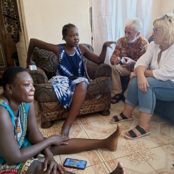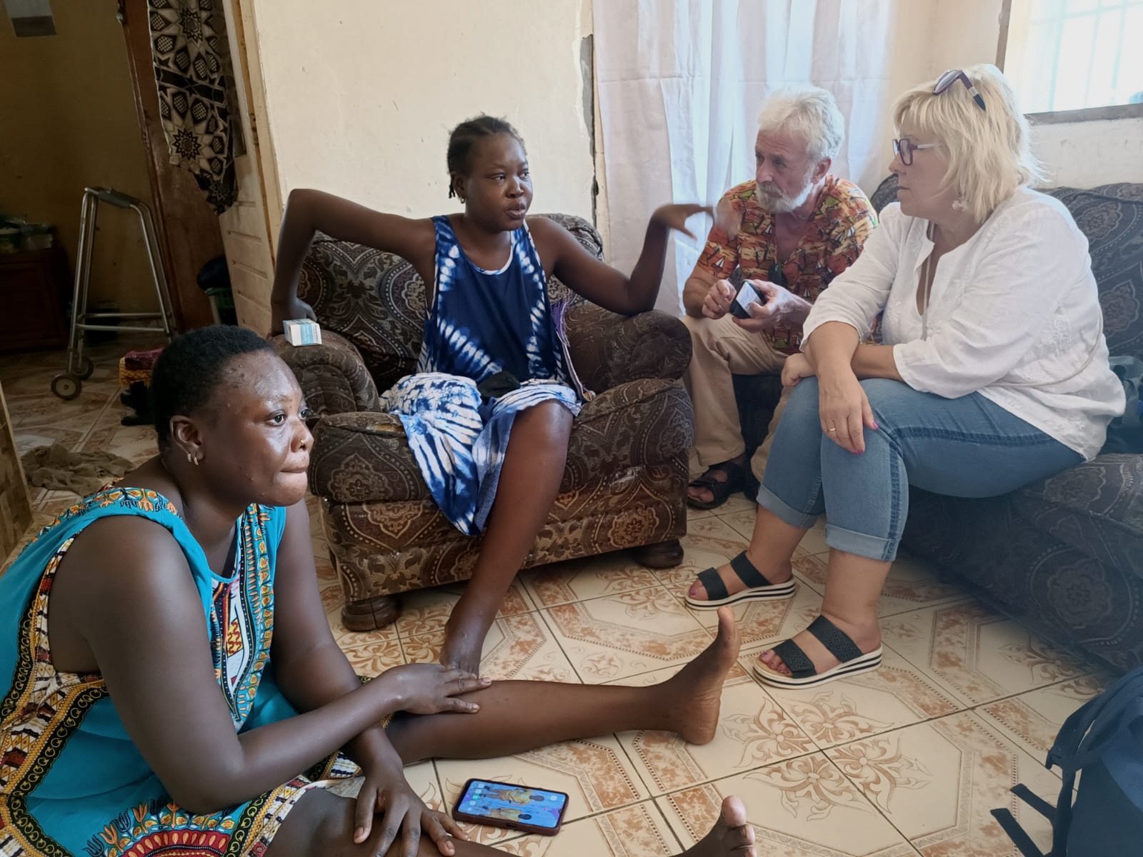 In Banjul haben wir Amie Jobe besucht. Sie ist die Tochter von Ngoneh, die wir bei unserem ersten Besuch in Gambia im Februar 2003 kennengelernt hatten. Amie hat 2009 Typ1-Diabetes bekommen. Familienbesuche dort, Teilnahmen an allen Workshops, Kommunikation über WhatsApp, nichts hatte geholfen, um gute Blutzuckerwerte zu haben. Nach nun 14 Jahren ununterbrochenen schlechter HbA1c-Werte musste ihr der rechte Fuß oberhalb des Kniegelenks amputiert werden, und das in einem Alter von 24 Jahren!! Sie lebt nun zusammen in der Familie ihrer Schwester Ndey Fatou.