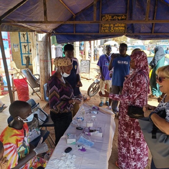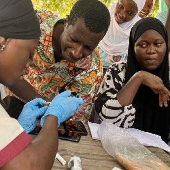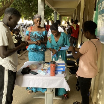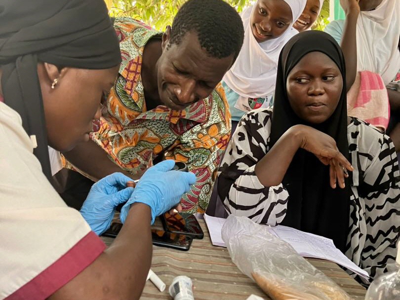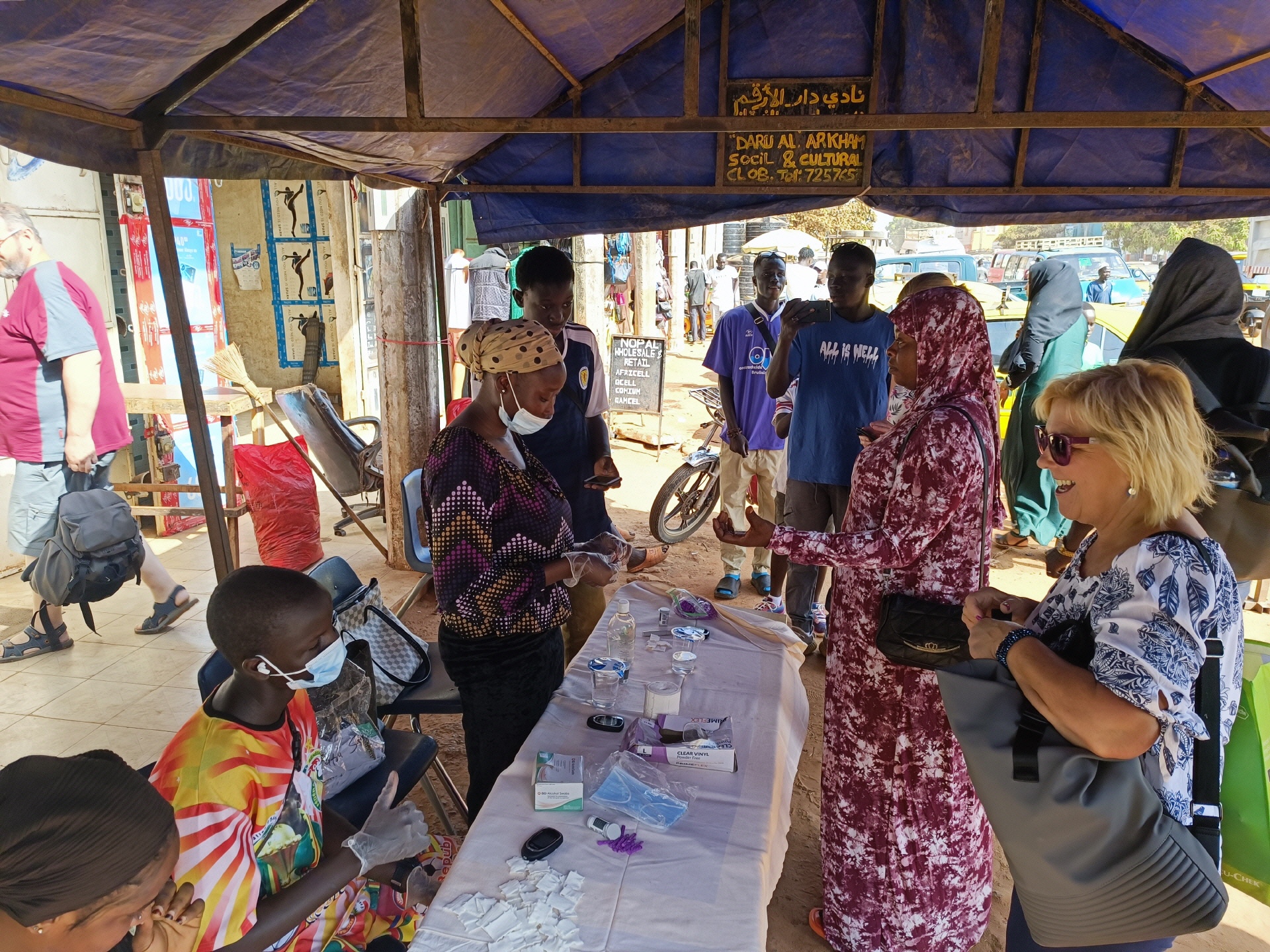 Vor dem Labor hatte die Gruppe um Isatou und Ousman einen Pavillon aufgebaut, da wurde fleißig bei interessierten Passanten der Blutzucker gemessen.
