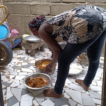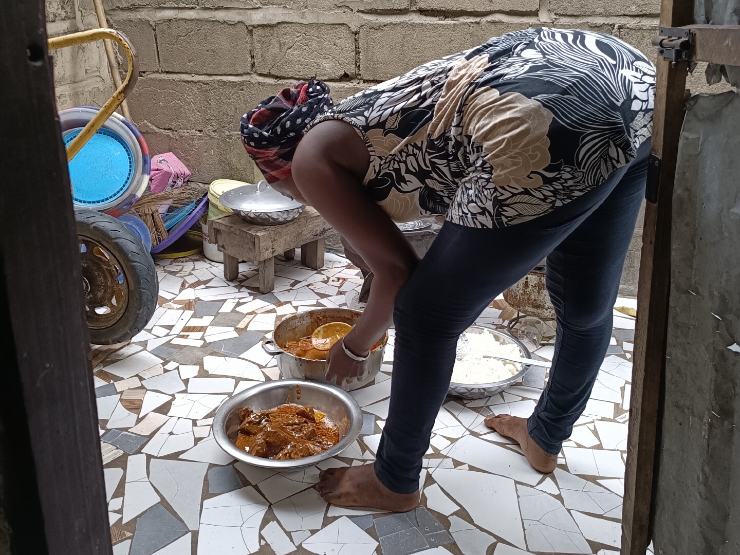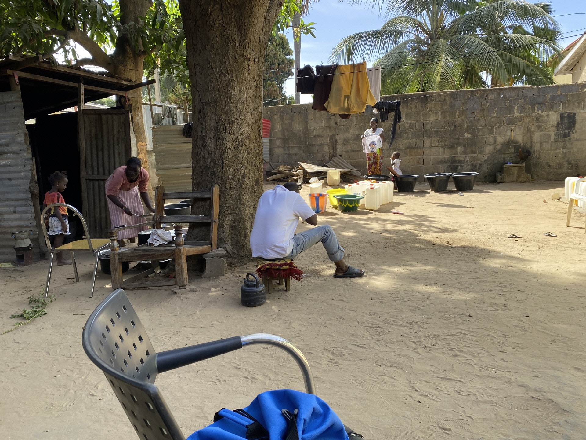Ousman Ceesay hatte uns alle für den Nachmittag um 14 Uhr zum Lunch eingeladen. Wir waren das erste Mal bei ihm daheim. Er wohnt in der Nähe des Serekundamarktes in seiner sehr großen Familie, und seit ein paar Wochen hat er ein eigenes Zimmer. Sein Vater hat drei Frauen und insgesamt 18 Kinder!