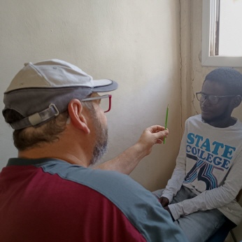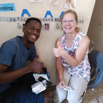 Anschließend ging es weiter zu Rilwan Lowe, er wurde nun auf die ICT (Basal- und Mahlzeiteninsulin) eingestellt. Bisher hatte er das Mischinsulin 30/70 gespritzt, und Actrapid. Wir hoffen, dass er mit unserer Schulung zurechtkommt und alles verstanden hat. Es sind halt schon viele neue Informationen für ihn. Er hat schon seit langer Zeit einen Job, er arbeitet als Tankwart.