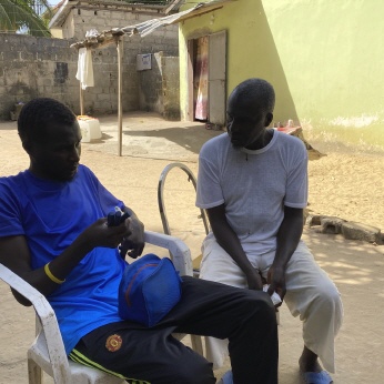 Ein Besuch bei der kleinen Mariama Ndow, um nach dem Libresensor zu schauen. Gestern wurde er während der Kinderschule herausgerissen. Wir haben ihn neu gesetzt, sie hat noch 6 ungebrauchte, das reicht für zweieinhalb Monate. Sheriff kam dazu, er hat ein Mobilephone überreicht bekommen (hat Katja gespendet). Zwei Stunden später war es schon mit WhatsApp aktiv!