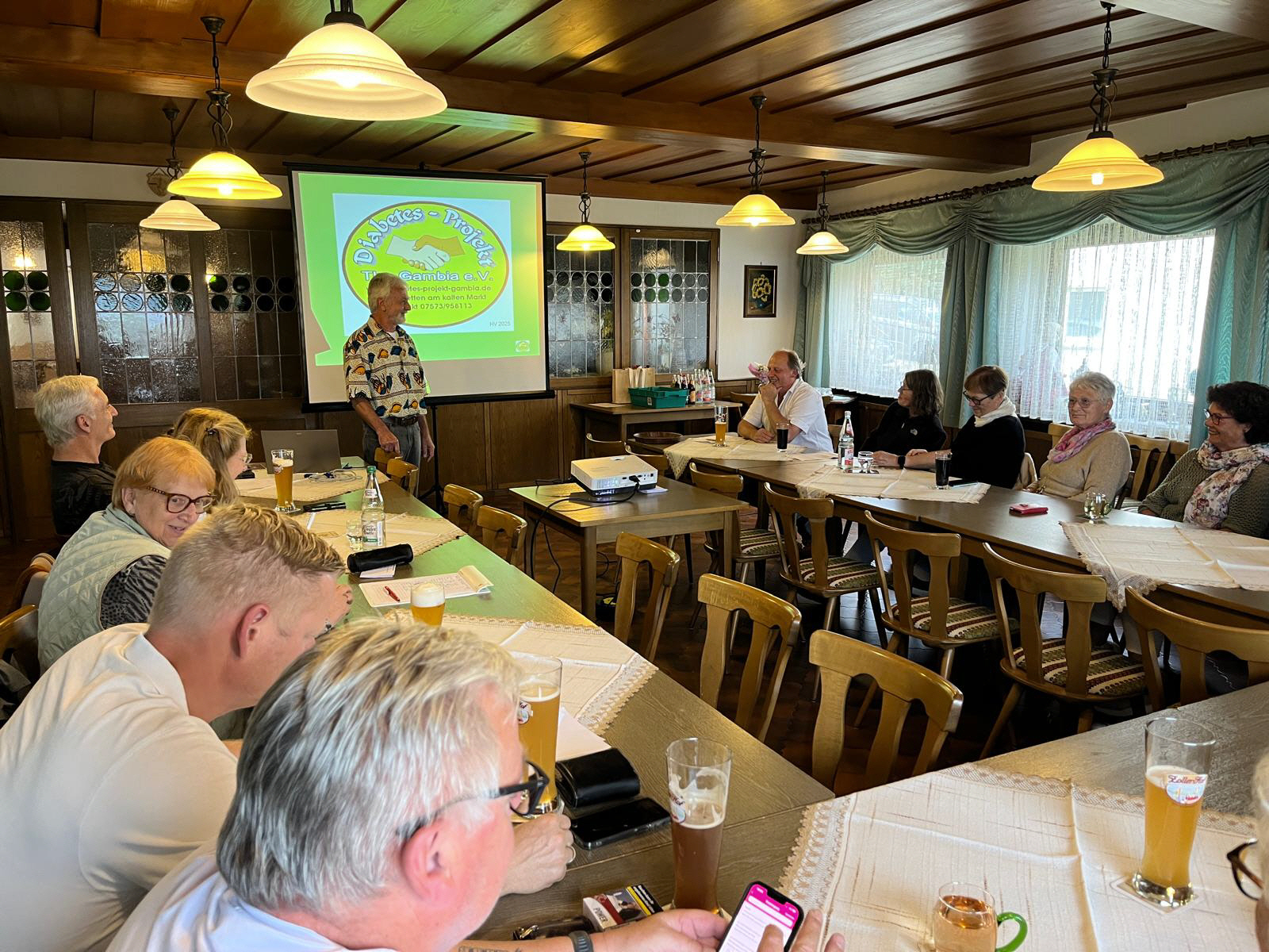 Mit dem Motto: "Erfahrung lässt sich nicht an einem einzigen Ort sammeln" begann Roland, und berichtete zunächst über die Gambiareise 2024, die Katja Waezsada, Gudrun und er selbst angetreten hatten. Der Flug mit SN Brussels war pünktllich, nach der Ankunft in Gambia hatte Abou, unser bewährter Taxifahrer, uns am Flughafen abgeholt und die Drei ins Bungalow Beach Hotel (Kotu) gebracht. Am Ankunftstatg wurde alles ausgepackt, sortiert und vorbereitet.