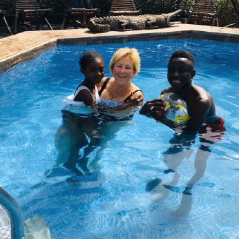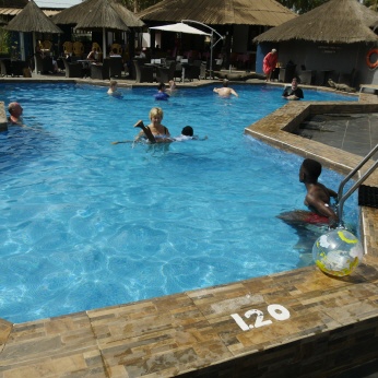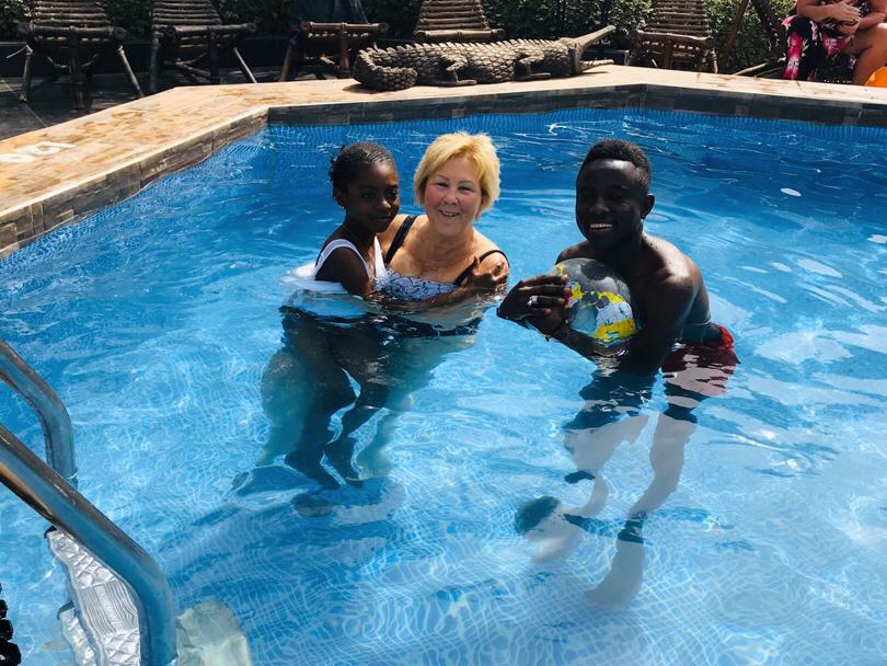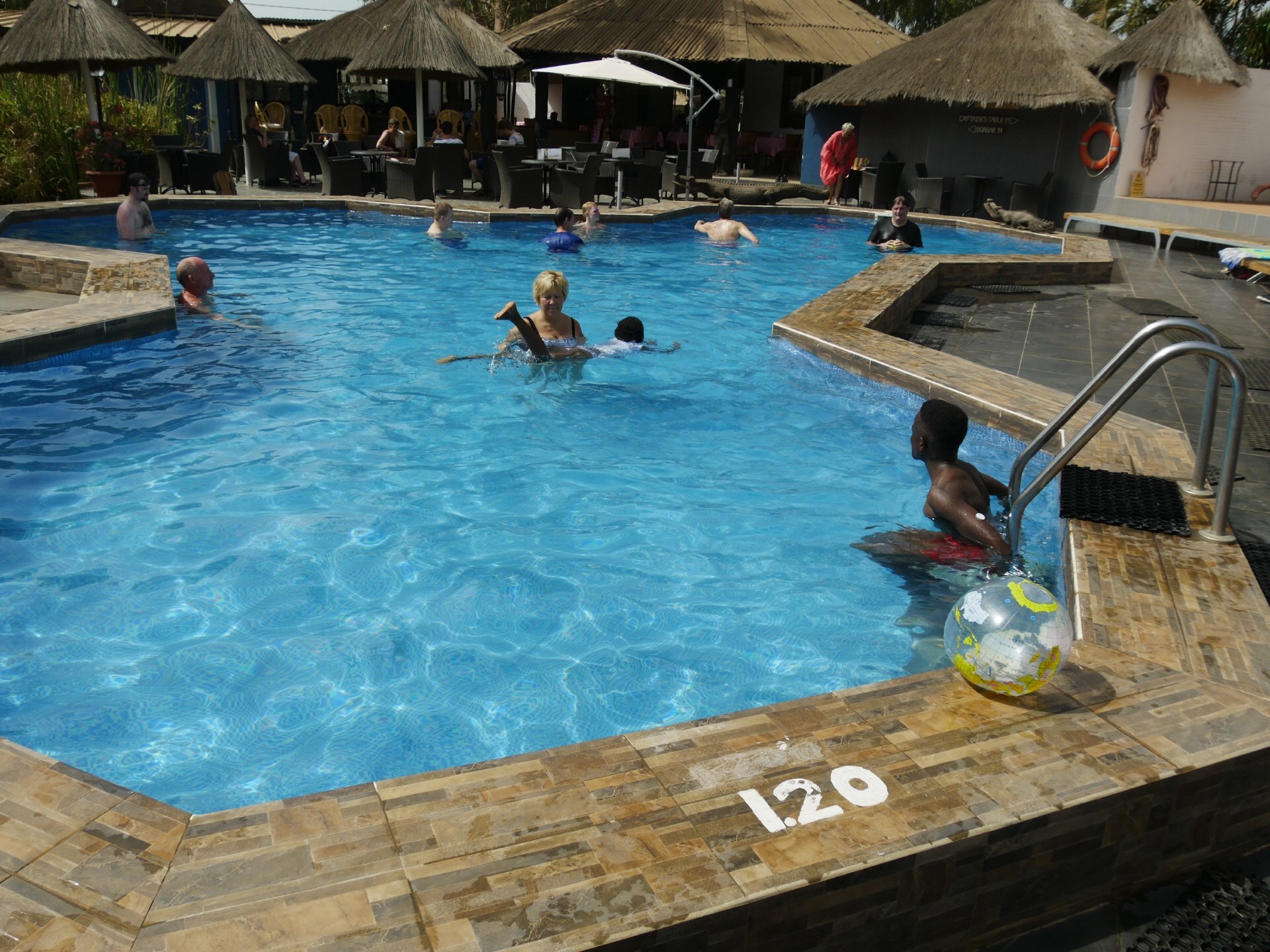 Mariama und Musa wollten unbedingt in den Hotelpool, Gudrun und Conny sind mit ins Wasser.