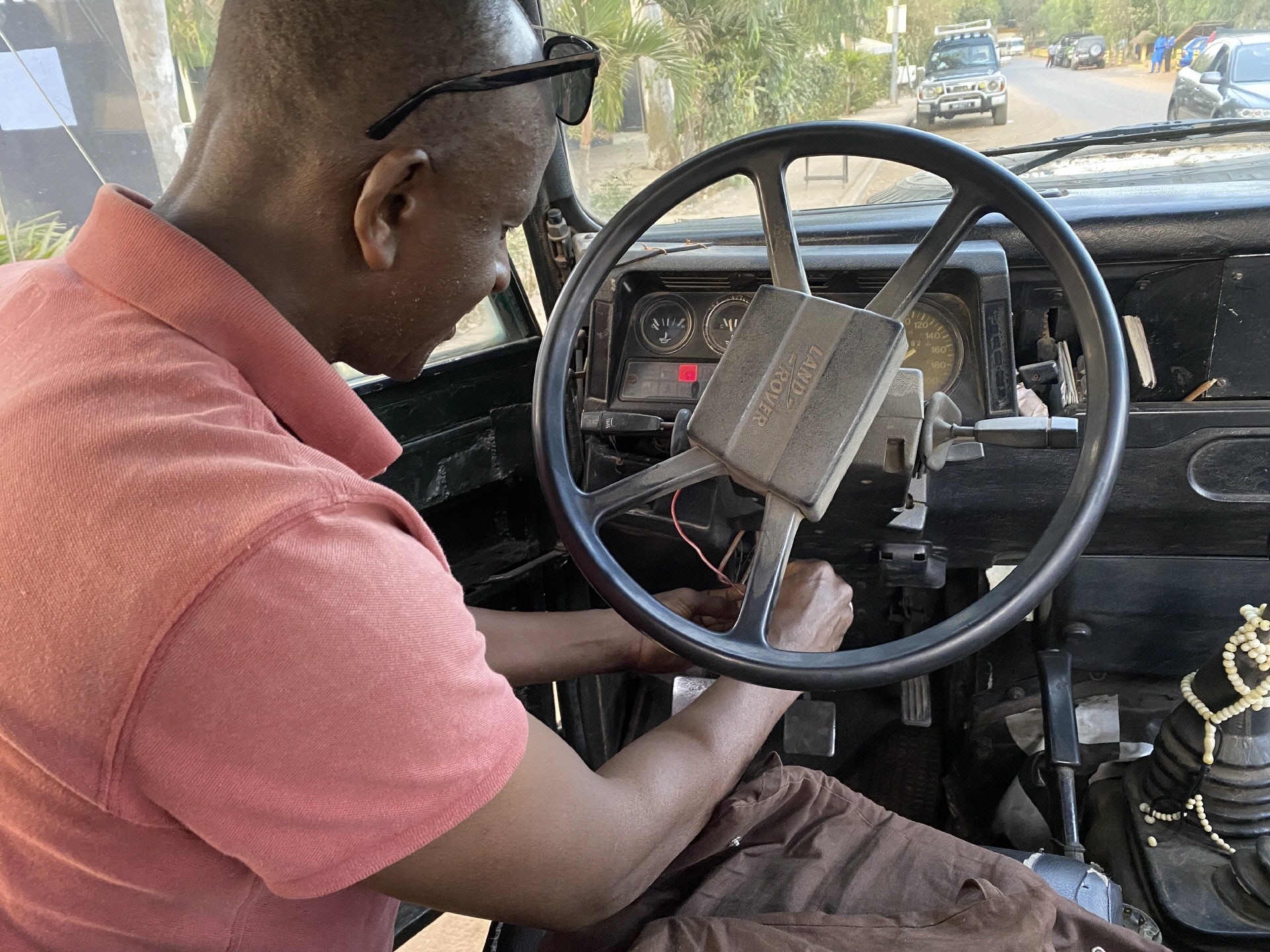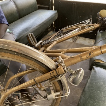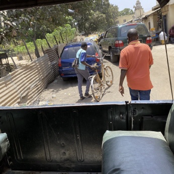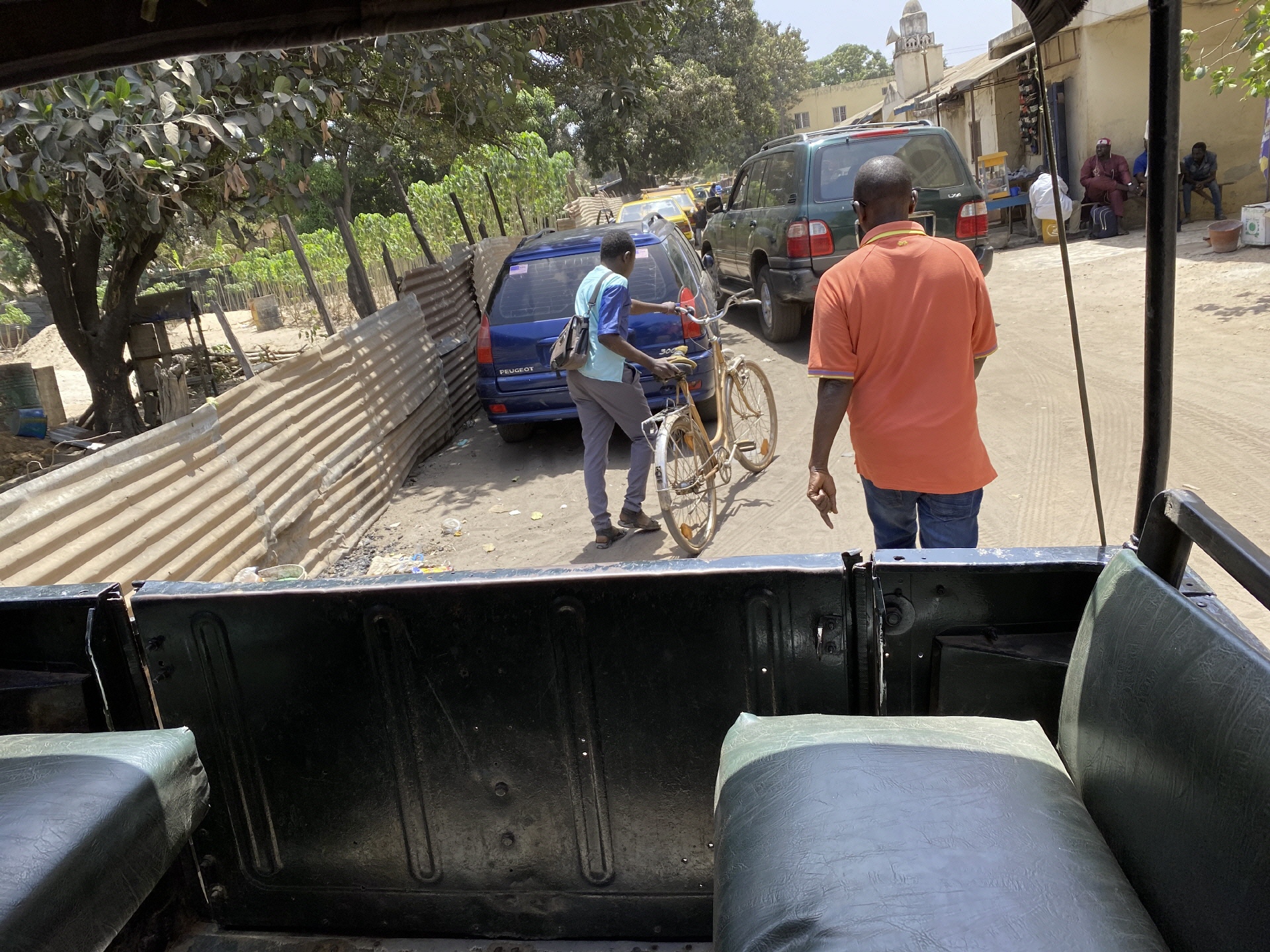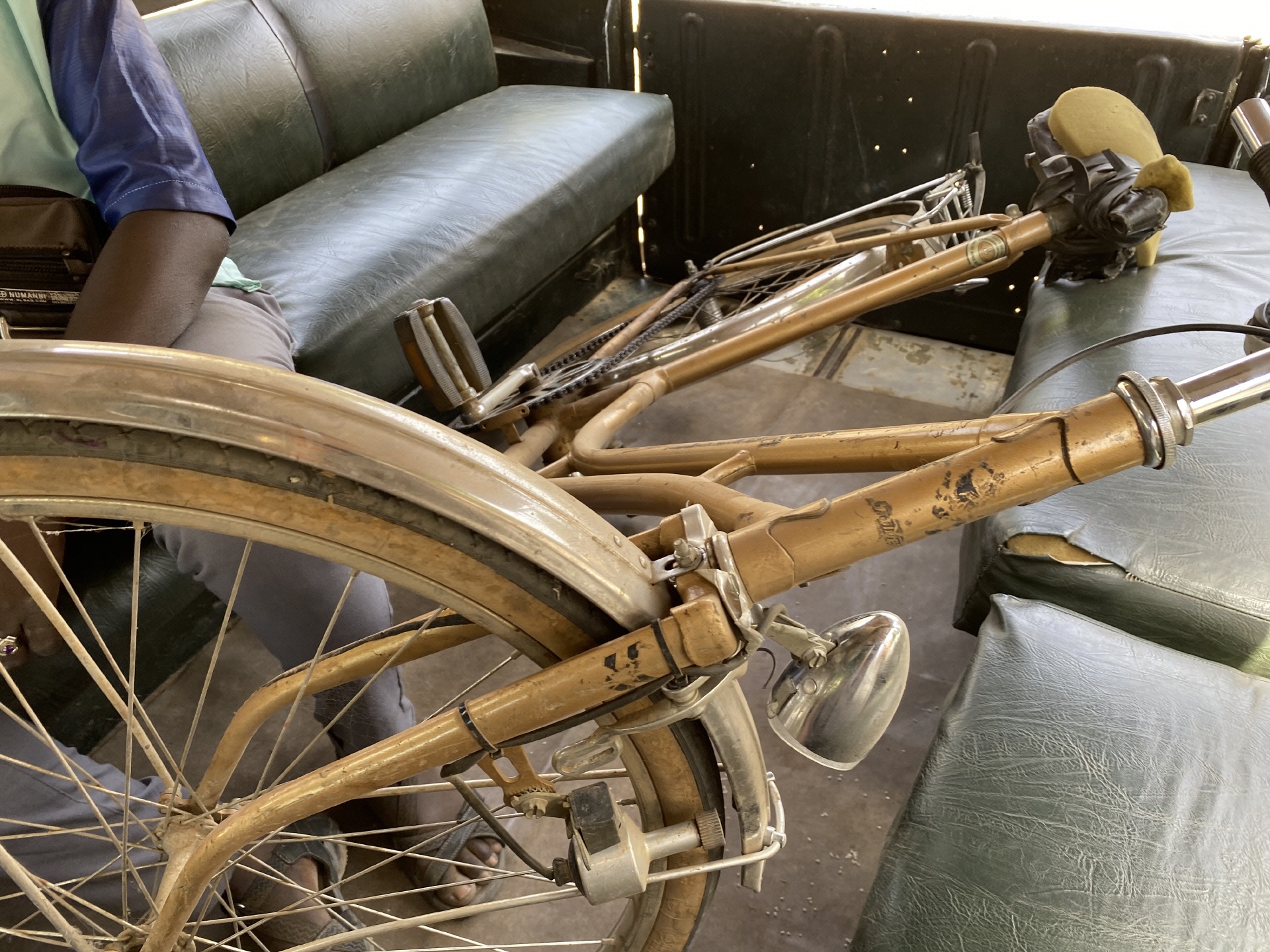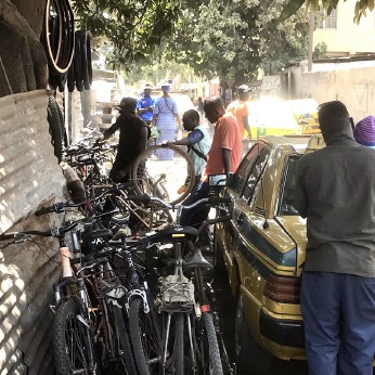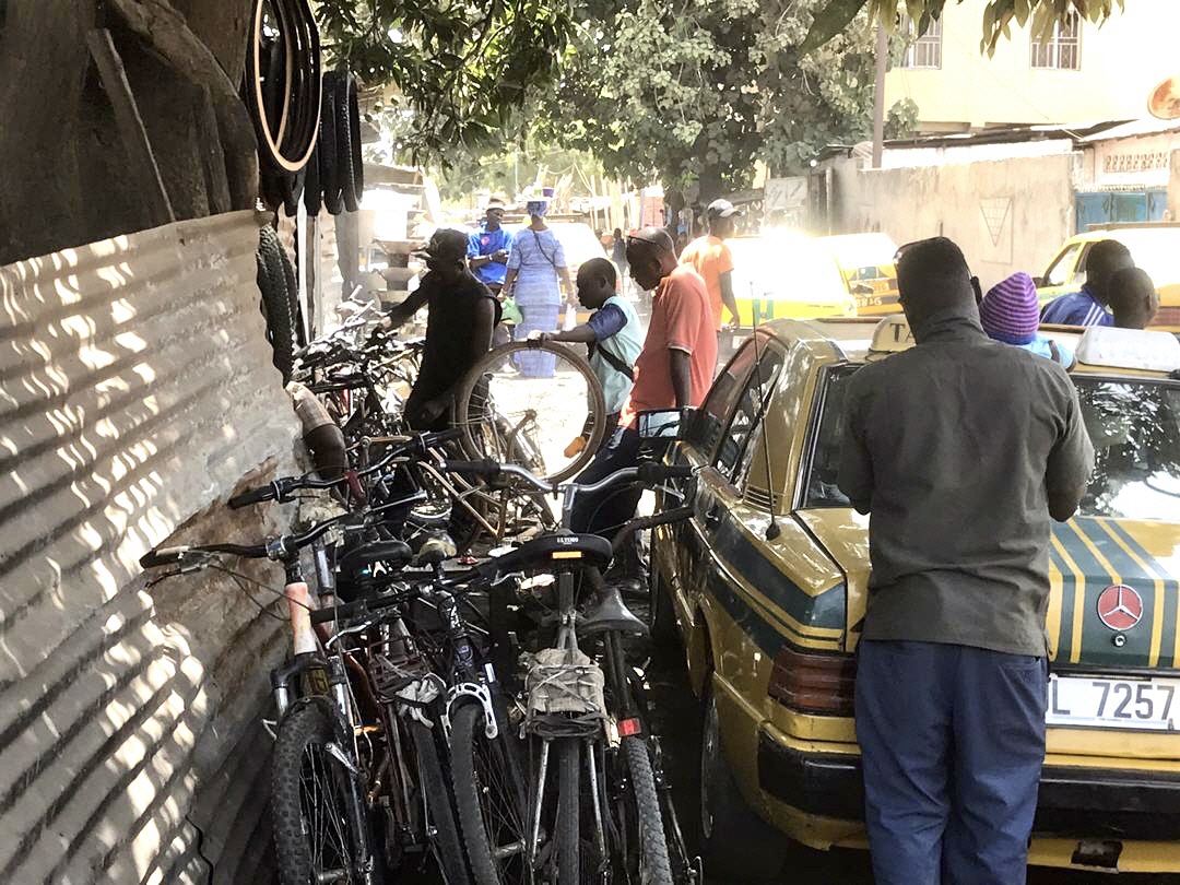 Sein Fahrrad aus dem Container April 2019 hatte platte Reifen, und anschließend sind wir in die Fahrradwerkstatt, um es reparieren zu lassen. Für zwei neue Reifen haben wir 300 Dalasi ausgegeben, ca. 5,50 €.