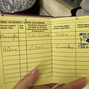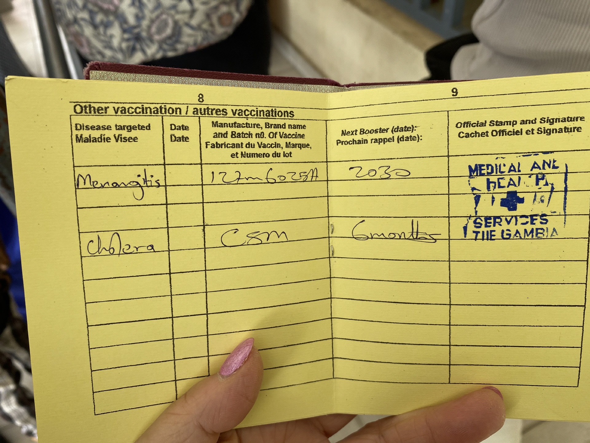 Dort wurde uns neben dem Einreisestempel Fieber gemessen, alle waren bei 36 Grad. Da ein Impfbuch verlangt wurde, und das hatten wir nicht dabei, wurden wir in ein Büro gebeten. Wir erhielten ein Impfbuch für je 250 Dalasi (ca. 5€), versehen mit Namen usw., und wir waren plötzlich, ohne Impfung, alle gegen Gelbfieber, Diphterie und Cholera geimpft. Aha.