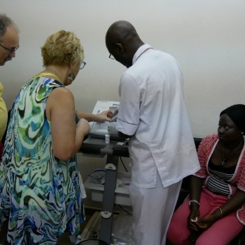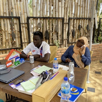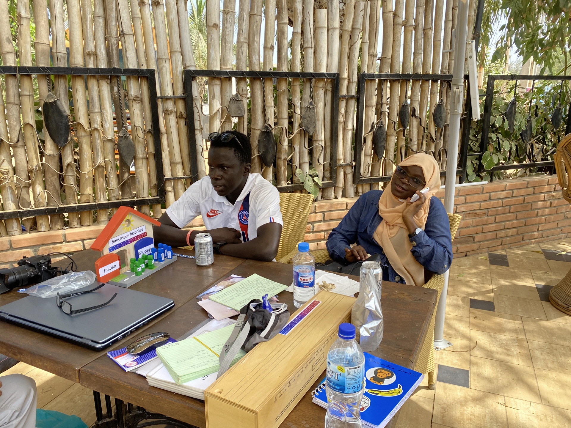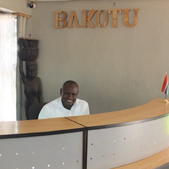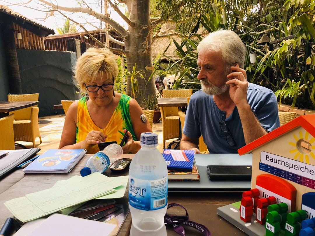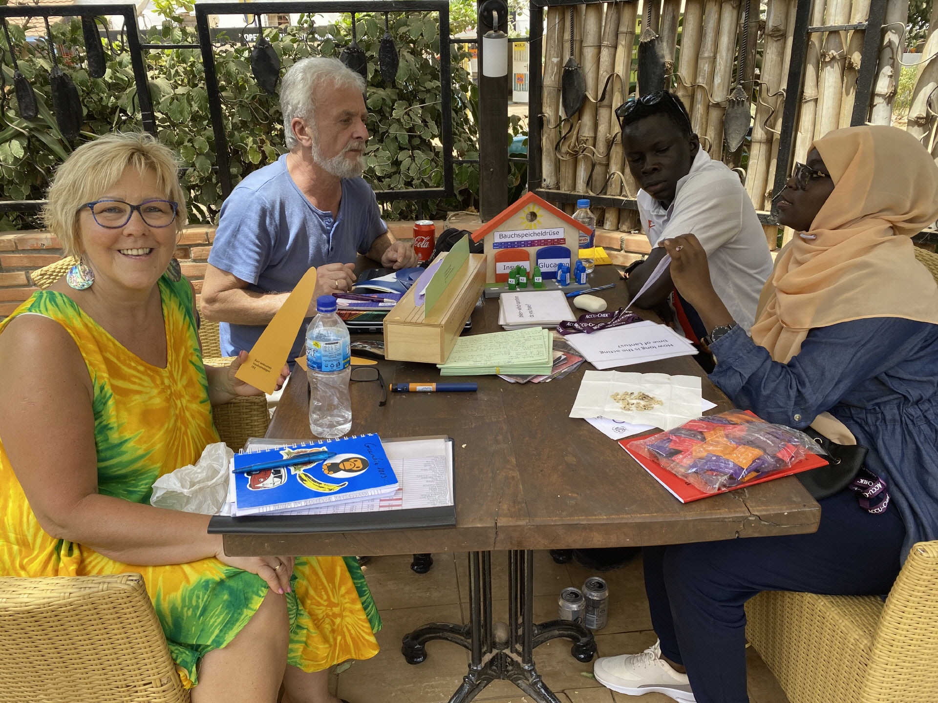 Heute Morgen kamen Isatou Jallow und Ousman Ceesay ins Hotel, das sind unsere beiden, die hier Familien mit Diabetikern besuchen. Zum Beispiel bei Isatou daheim ein Diabetestraining anbieten und durchführen (am Wochenende), und auch in der Pakalaklinik helfen, wenn Dr. Gaye Unterstützung braucht.