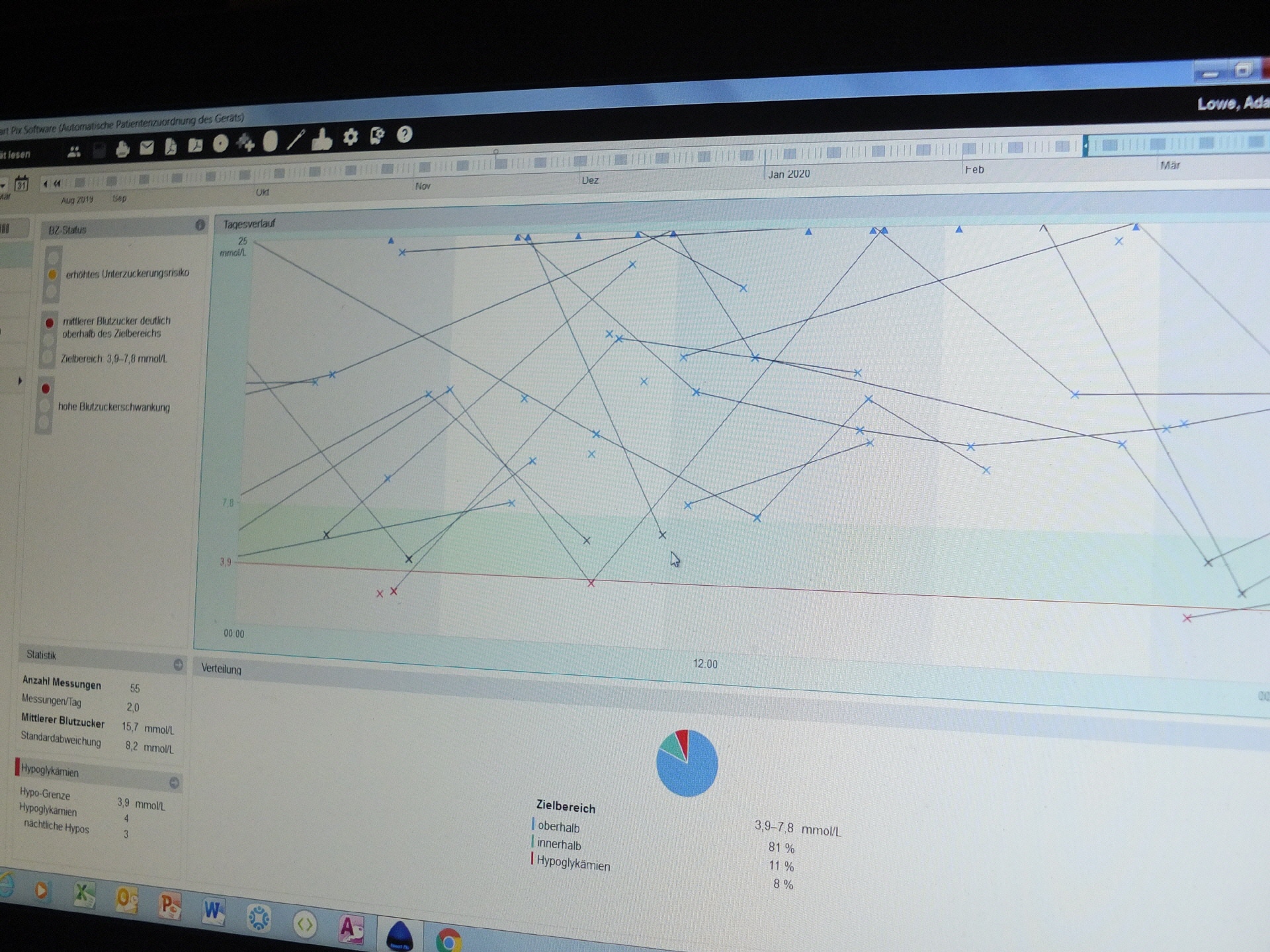 Die Daten seines Libre (kontinuierliche Glucosemessung) haben wir ausgelesen, die Kurve sah gut aus! Sein HbA1c-Wert im November war 13,1%, jetzt hat er 8,7% (gemessen am 20.3.), das freut uns sehr!