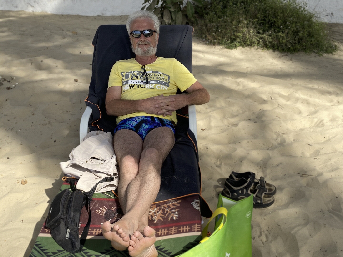 Mit einem Spaziergang am Strand hat dieser Tag geendet. Conny und Gudrun haben zwei Butterfische gekauft, die wir in die Hotelküche gebracht haben, für ein leckeres Abendessen.