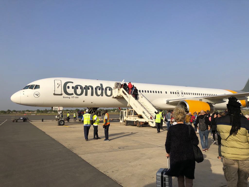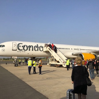 Bis ca. 3.30 Uhr waren geschätzte 800 bis 900 Menschen vor dem Flughafengebäude versammelt. Überwiegend Deutsche, aber auch andere Nationen aus Europa. Wenig später wurde dann der Check-in geöffnet, plötzlich war keine Schlange mehr da, sondern ein Klumpen von denen, die ausreisen wollten. Hilfe, Corona!!! Es wurde nach einer Exceltabelle gearbeitet und dann Einlass gewährt, mit Reisepass und "Passagierschein". Nach der Gepäckaufgabe ging’s ins alte Terminal (das neue wird gerade renoviert), und dann hieß es warten. Drei Condor-Maschinen standen auf dem Rollfeld, eine sollte nach Düsseldorf fliegen, die anderen beiden nach Frankfurt. Gegen 7 Uhr durften zunächst die "Düsseldorfer" einsteigen, wir konnten gegen 8.30 in den Bus und wurden zum Flieger gebracht.