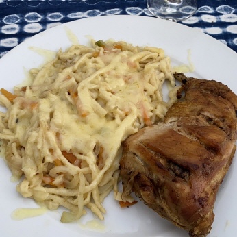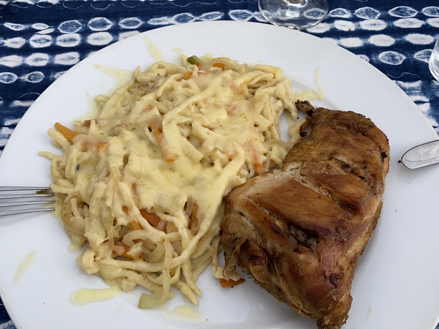 Ok, Koffer auffüllen (einen Koffer mussten wir zurücklassen) - sortieren, zuklappen, ein letztes Abendessen hat uns der Hotelkoch serviert, das hatten wir am Vortag bestellt: Käsespätzle mit Hühnerschenkel....