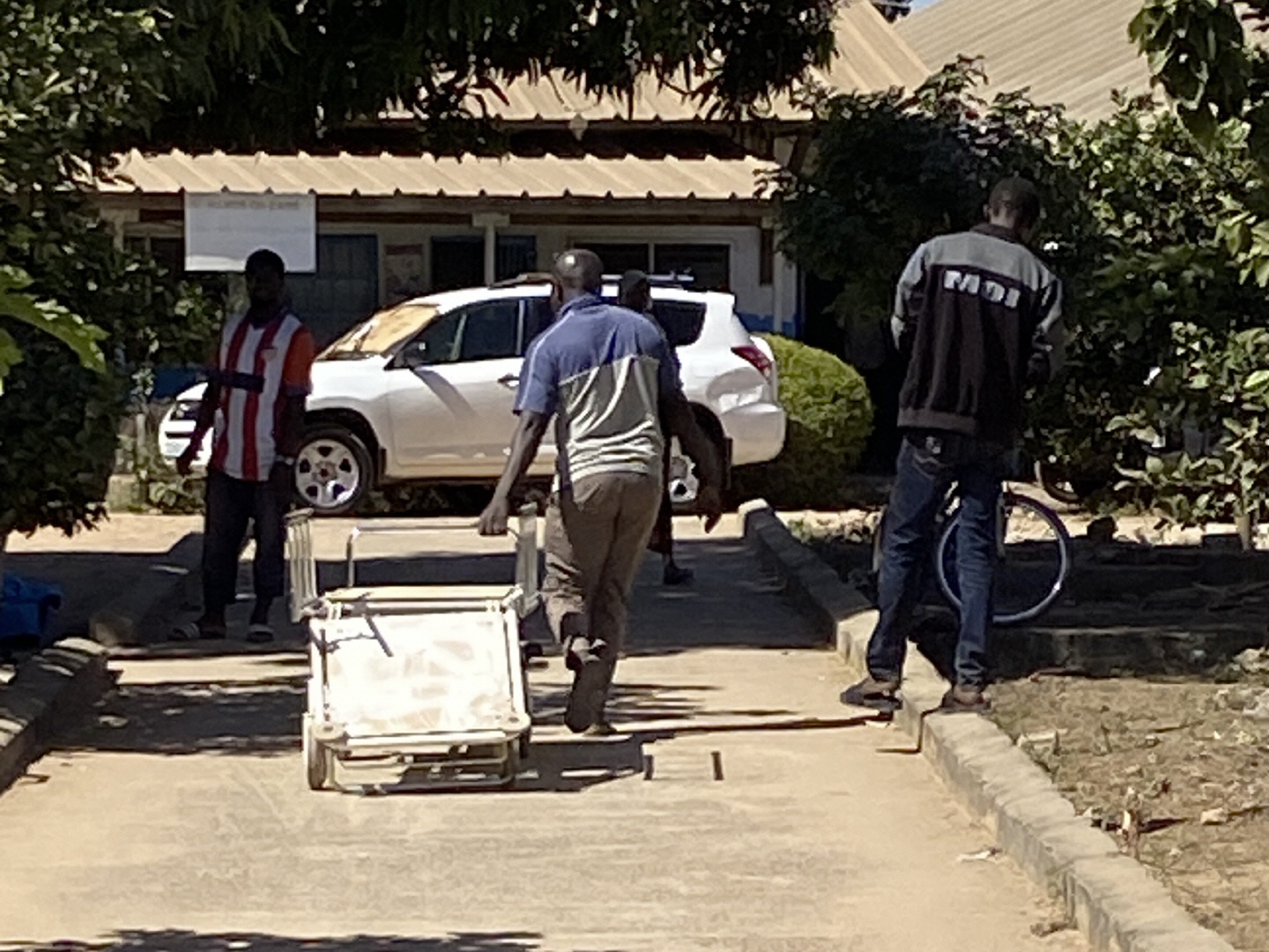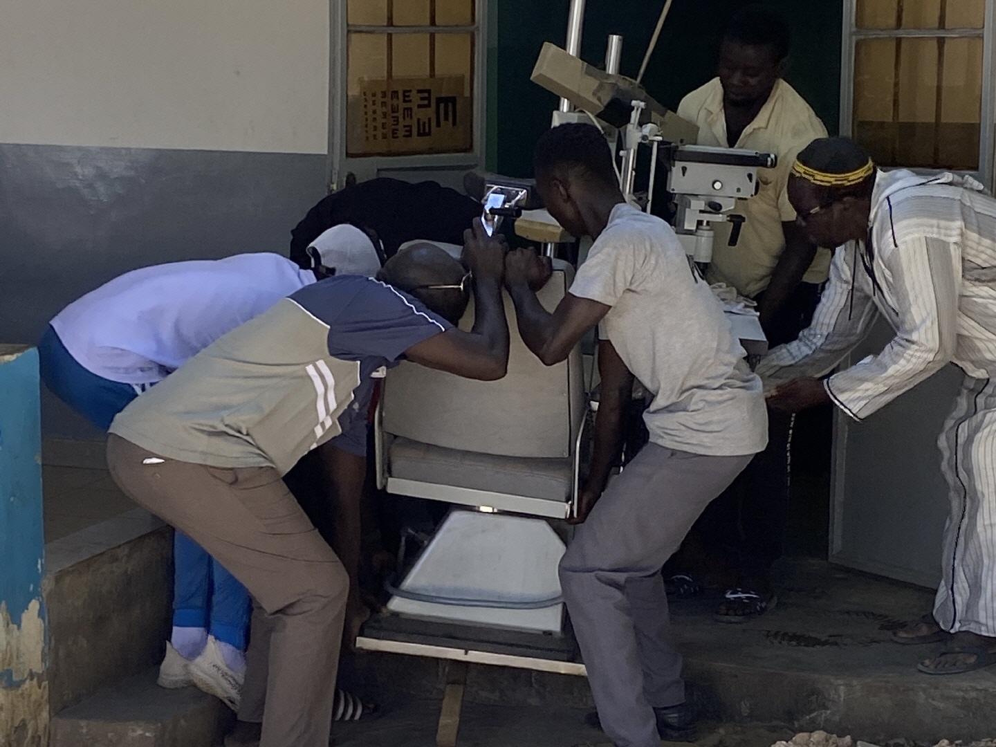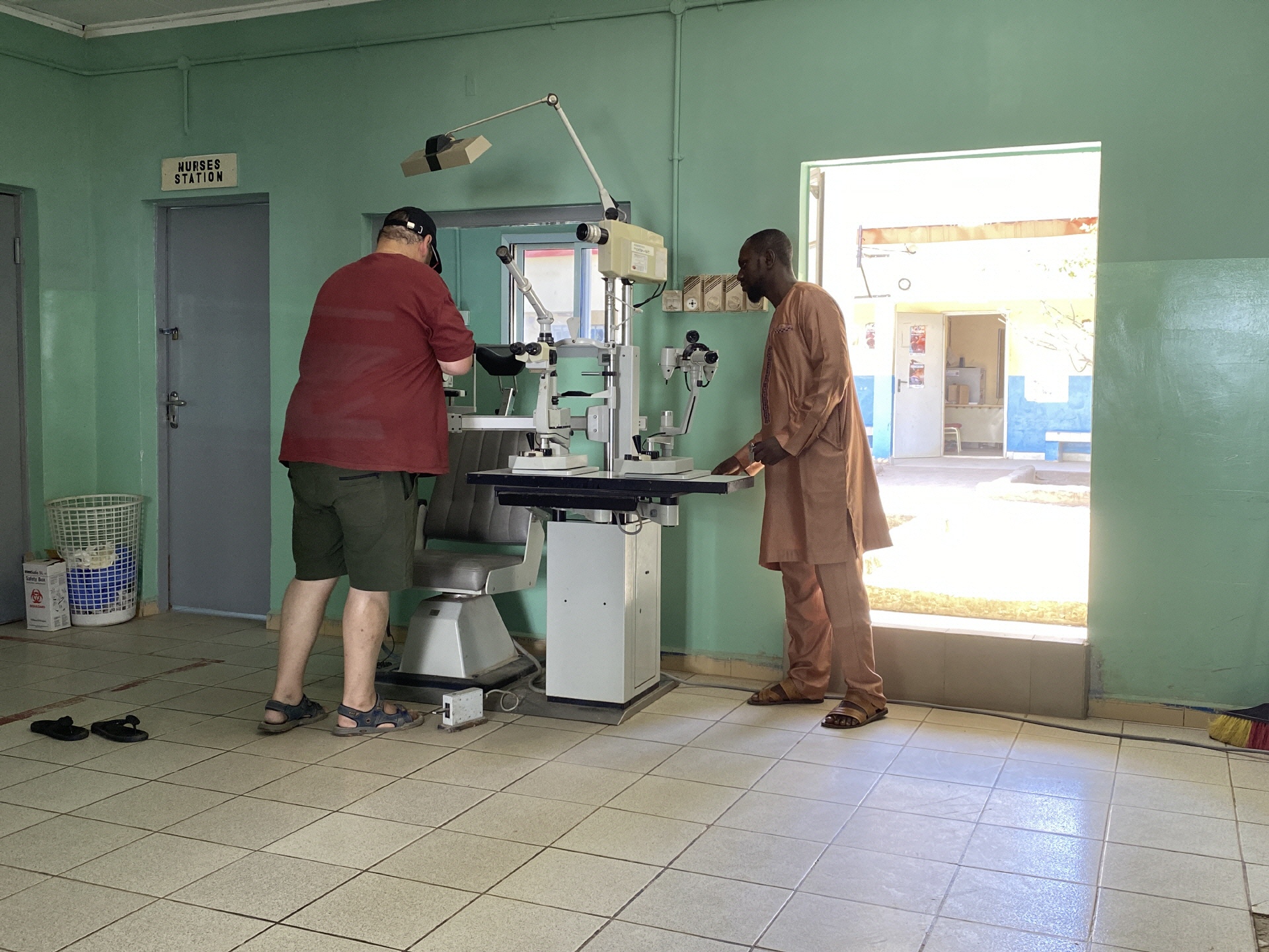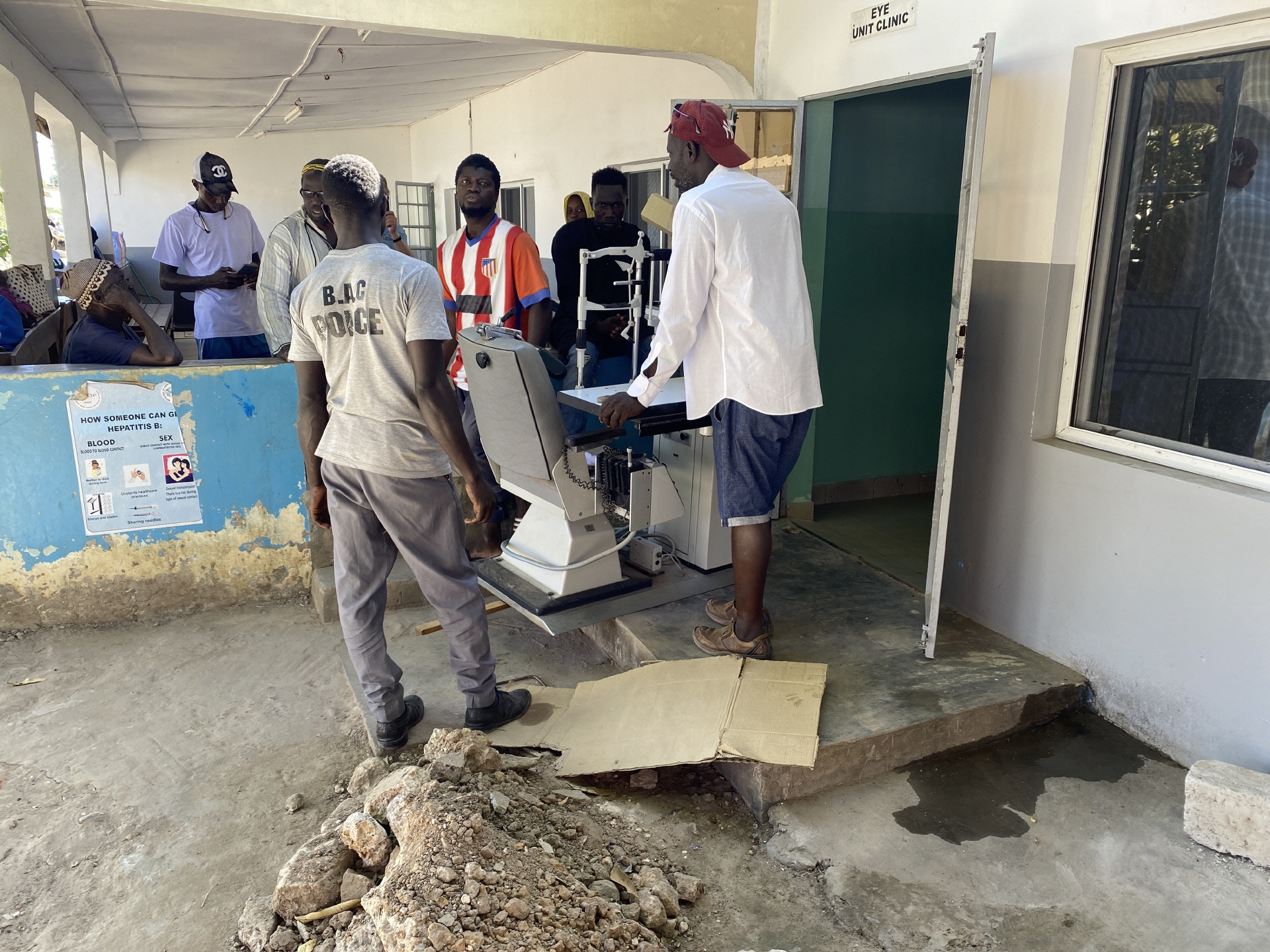 Heute haben sich Klaus, Steffen (Optik Pfeiffer Stetten) und Roland die Zeit genommen, um nach der Refraktometereinheit in der Brikama-Augenklinik zu schauen. Dort angekommen, wurde sie gleich gefunden. Sie stand am gleichen Ort, wo Steffen sie im November 2021 aufgebaut hatte, etwas eingestaubt, nie benutzt. Wir haben dort gleich den Arzt Ousman B. Ceesay getroffen (er macht Augen-OPs), er möchte sie gerne nutzen, aber direkt auf der Augenstation. Wir mussten Werkzeug kaufen, da war in der Klinik nichts aufzufinden! Sechs Gambier aus der Klinik haben wir zusammengetrommelt, es wurde ein fahrbares Unterbett herangerollt, ein Stück Baumstamm aus der Klinik, der irgendwo herumlag. Mit vereinten Kräften (Maschine wiegt 350kg?) wurde das Gerät um das Gebäude getragen/gefahren und an den Platz geschafft, wo sie in Betrieb genommen werden sollte. Steffen hat alles kontrolliert, bis sie wieder funktionsfähig war. Na dann. Das hätten wir wohl schon 2 Wochen machen sollen!!