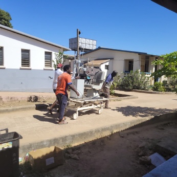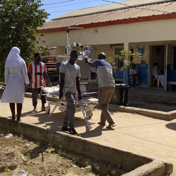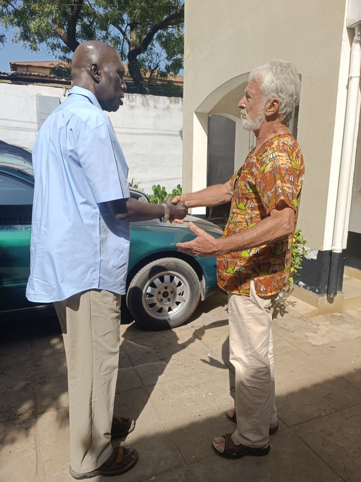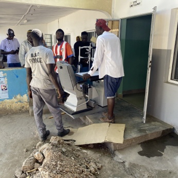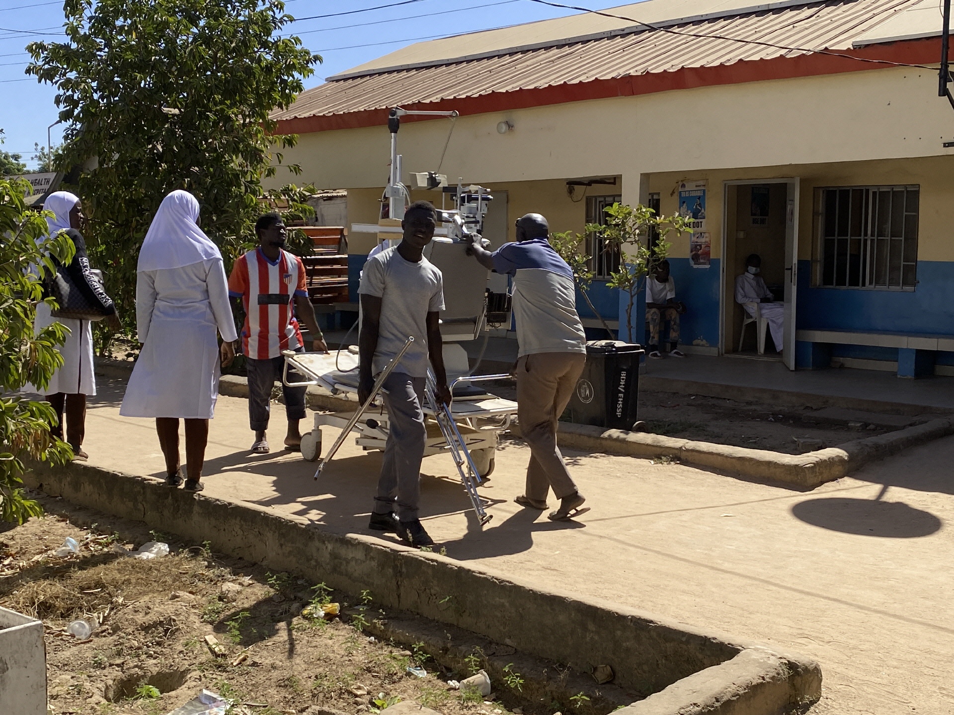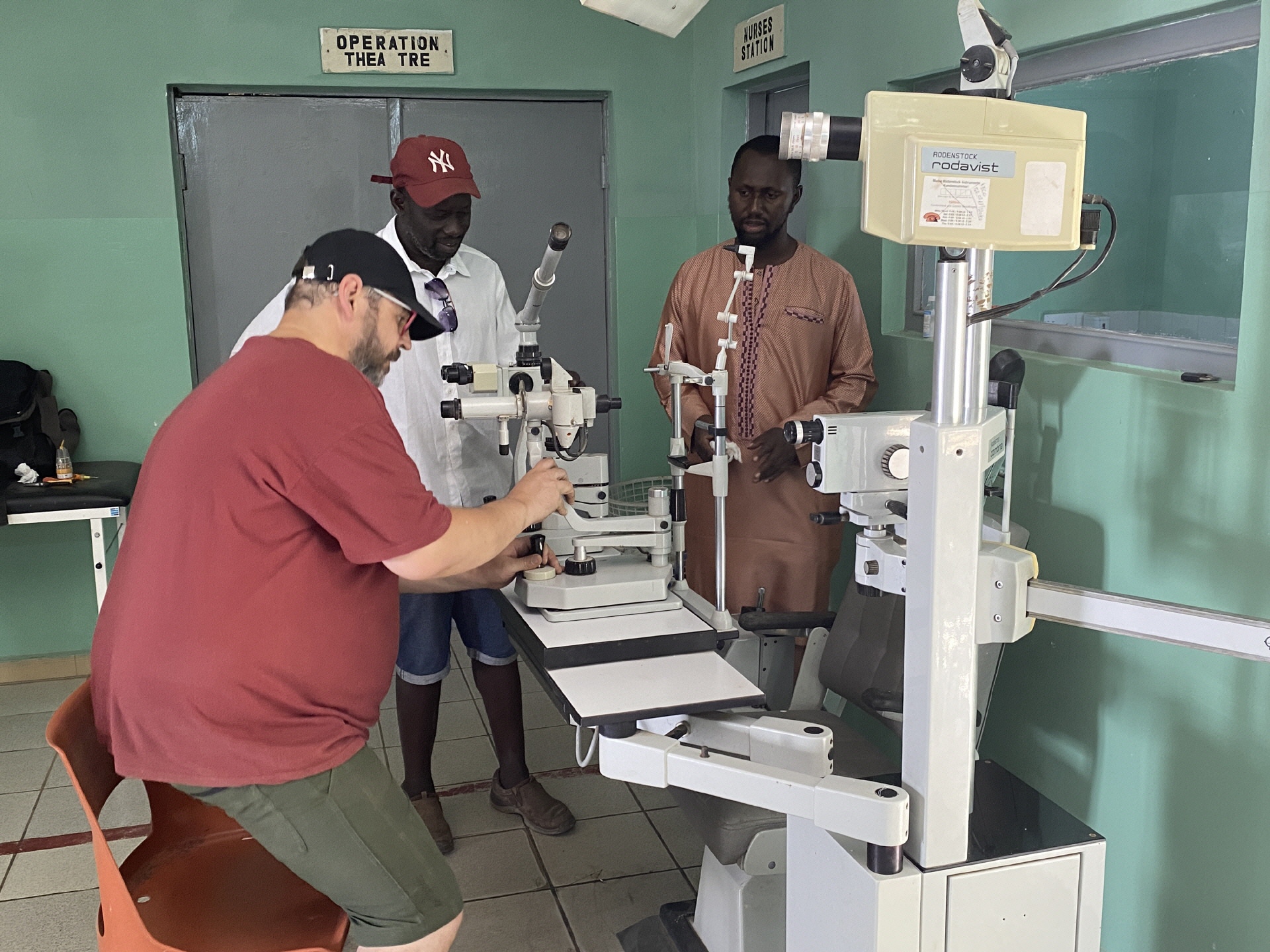 Heute haben sich Klaus, Steffen (Optik Pfeiffer Stetten) und Roland die Zeit genommen, um nach der Refraktometereinheit in der Brikama-Augenklinik zu schauen. Dort angekommen, wurde sie gleich gefunden. Sie stand am gleichen Ort, wo Steffen sie im November 2021 aufgebaut hatte, etwas eingestaubt, nie benutzt. Wir haben dort gleich den Arzt Ousman B. Ceesay getroffen (er macht Augen-OPs), er möchte sie gerne nutzen, aber direkt auf der Augenstation. Wir mussten Werkzeug kaufen, da war in der Klinik nichts aufzufinden! Sechs Gambier aus der Klinik haben wir zusammengetrommelt, es wurde ein fahrbares Unterbett herangerollt, ein Stück Baumstamm aus der Klinik, der irgendwo herumlag. Mit vereinten Kräften (Maschine wiegt 350kg?) wurde das Gerät um das Gebäude getragen/gefahren und an den Platz geschafft, wo sie in Betrieb genommen werden sollte. Steffen hat alles kontrolliert, bis sie wieder funktionsfähig war. Na dann. Das hätten wir wohl schon 2 Wochen machen sollen!!