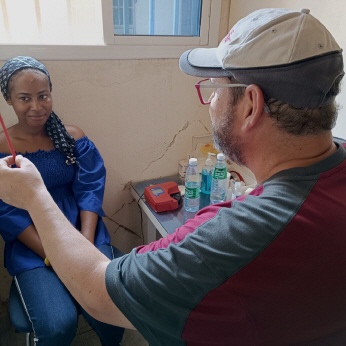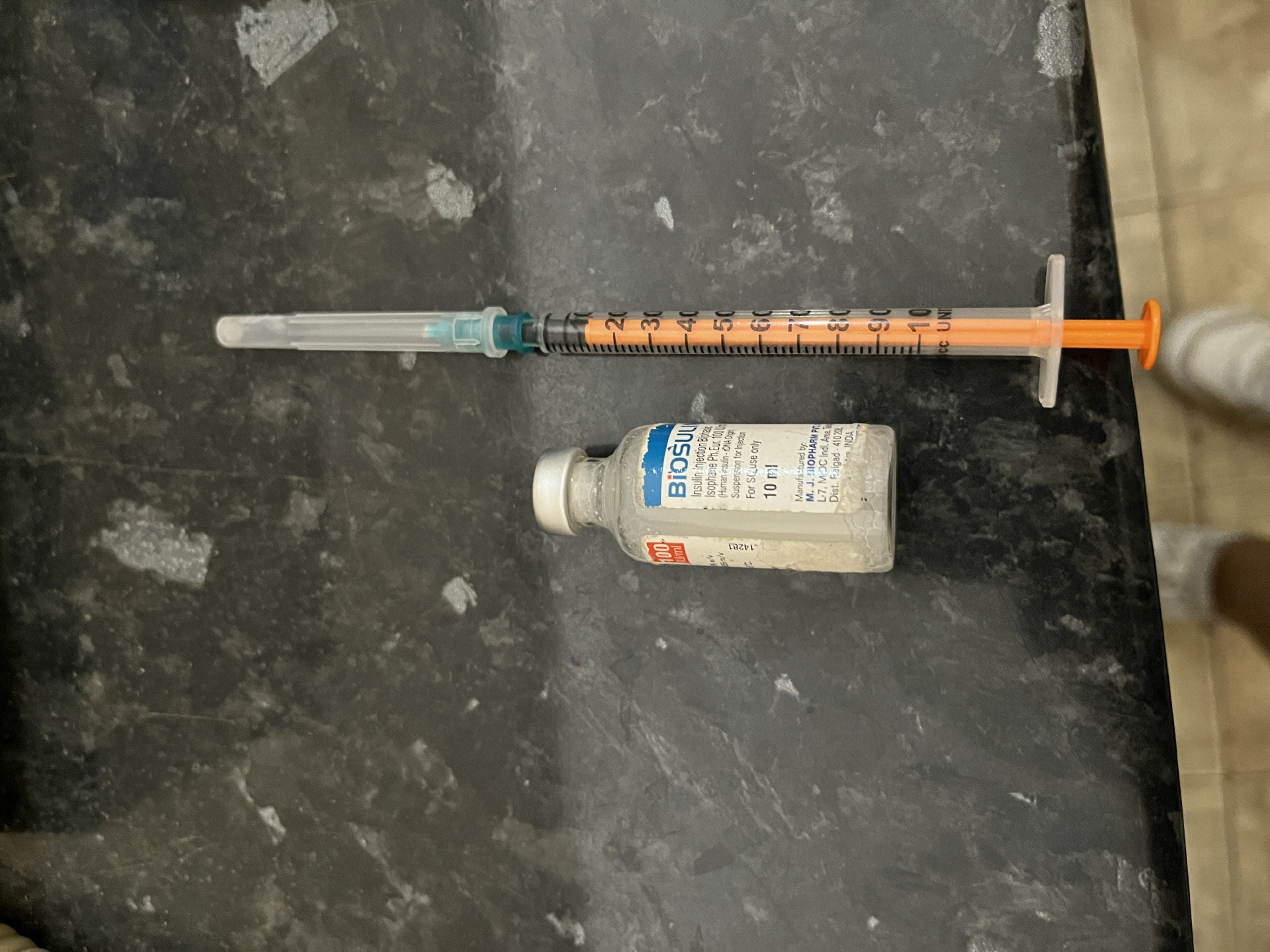 Zwei Tage hatten wir nun im Gudrun Medical Lab zugebracht. Einigermaßen übersichtlich ging es zu am Freitag mit 21 unserer Schützlinge zu. Am Samstag wurde es dann doch etwas chaotisch, und wir wurden fast überrand! 32 Typ1er kamen, darunter etliche Neumanifestierte, wir waren alle beschäftigt. Katja mit der Fußinspektion, Steffen mit Klaus beim Augencheck, Gudrun und Mariama mit Dembo (beide aus dem Lab) mit der HbA1c-Messung und Roland mit dem Auslesen von Blutzuckerwerten in den Laptop und den Dokumentationen. Berichtenswert war die Insulinspritze und das 10ml-Fläschchen von Mariama Sillah, siehe Bilder, und die bei den neumanifestierten Typ1ern, die nicht von der Pakalaklinik versorgt werden. Modou Lamin D. (10 Jahre alt) hatte seinen Diabetes im März bekommen, und wurde bisher mit Metformin versorgt. Da hatte er Glück, dass er vermutlich eine längere Honeymoonphase hatte (vorübergehende Erholung der Bauchspeicheldrüse nach der Erstdiagnose), sonst wäre er sicher schon an einer Ketoazidose verstorben.