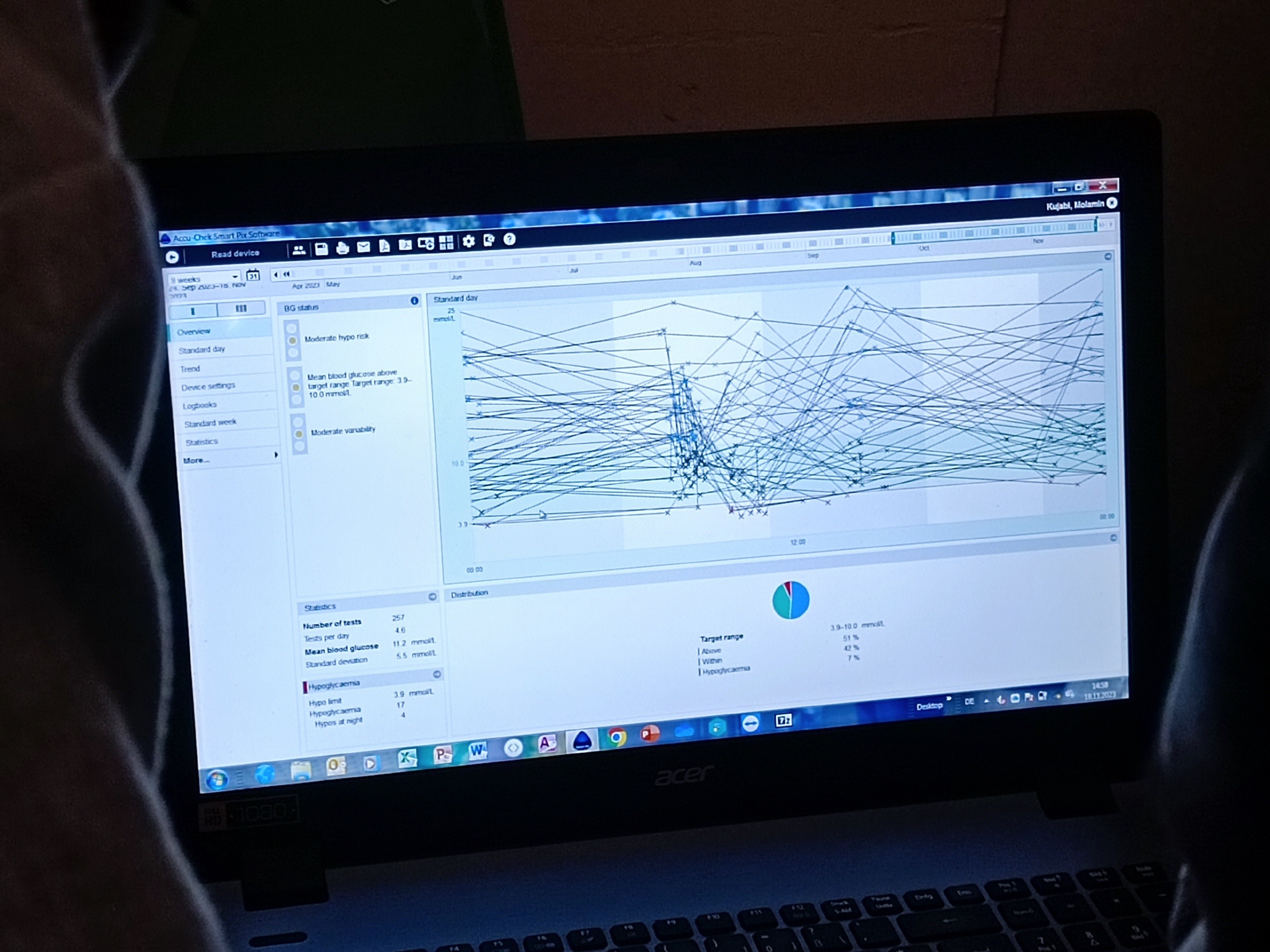 Fatoumatta ist Klassenbeste in der Schule. Sie hat einen Dexcom6-Sensor bekommen, da kann sie was lernen von Gewebezuckerverlauf. Die drei Sensoren arbeiten zusammen 1 Monat. Ihre sehr früh am Morgen gemessenen Werte sind oft bei 160 bis 180mg, und wir wollen schauen, warum das so ist.