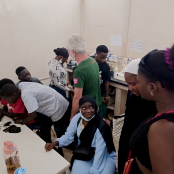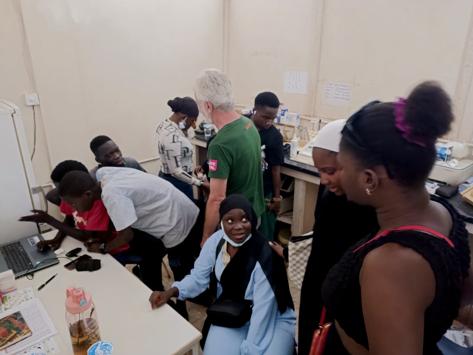 Vor dem Labor hatte die Gruppe um Isatou und Ousman einen Pavillon aufgebaut, da wurde fleißig bei interessierten Passanten der Blutzucker gemessen.