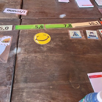 Katja hat den überwiegenden Teil des Workshops übernommen. Sie hatte tolles Anschauungsmaterial mitgebracht. Zunächst mussten alle ihren Blutzucker messen, es gab nur wenige höhere Ergebnisse, die dann korrigiert wurden. Im ersten Teil ging es über die Bedeutung der Blutzuckerkontrolle und die Wirkung der Insuline, daran anschließend wurden Karten von Lebensmitteln und Getränken sortiert nach Zuckergehalt.