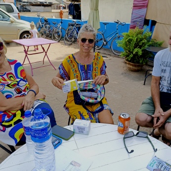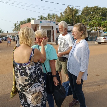 Elvira und Armin mit Mariella wollten ihren Schützling Musa kennenlernen. So haben wir uns am Vormittag nach Gunjur aufgemacht. An der Tankstelle dort haben wir uns zunächst mit Marjan Niemeijr aus Holland getroffen, sie hatte für unser Projekt Insulin gesammelt und hat es uns zur übergeben. Sie gibt hier Jogakurse.